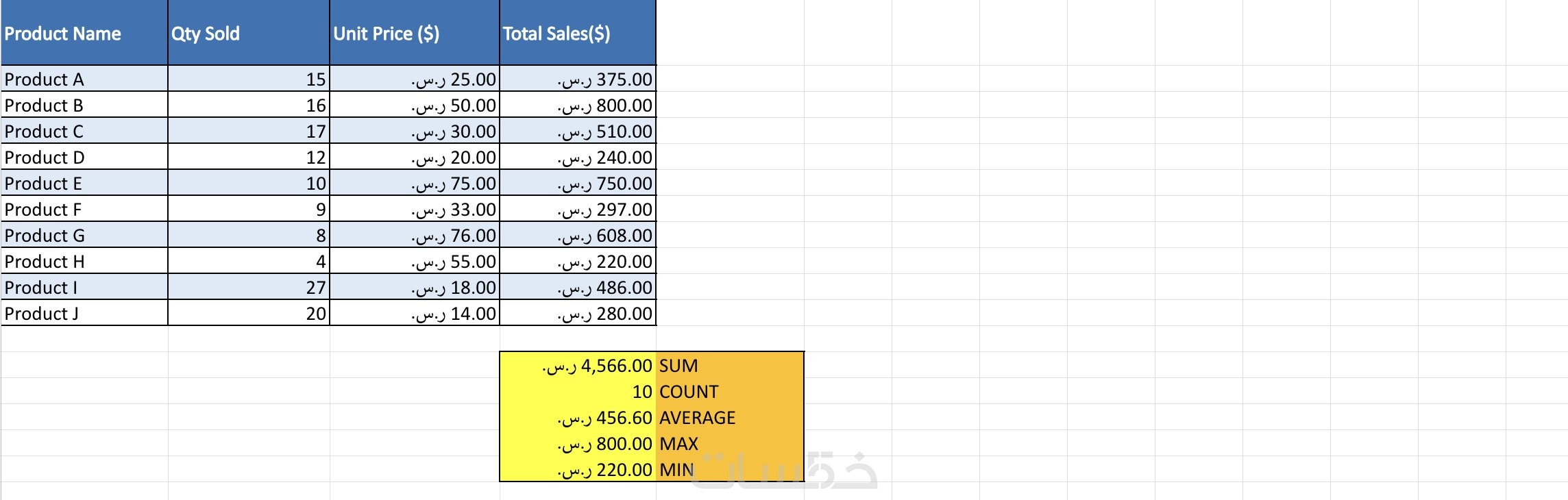 استخدام صيغ في برنامج اكسل مثل (sum,max,man, average)