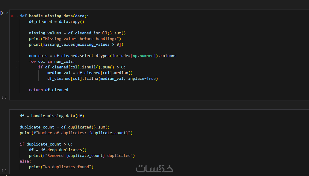 تنظيف القيم المفقودة والمكررة وتصحيح أنواع البيانات.