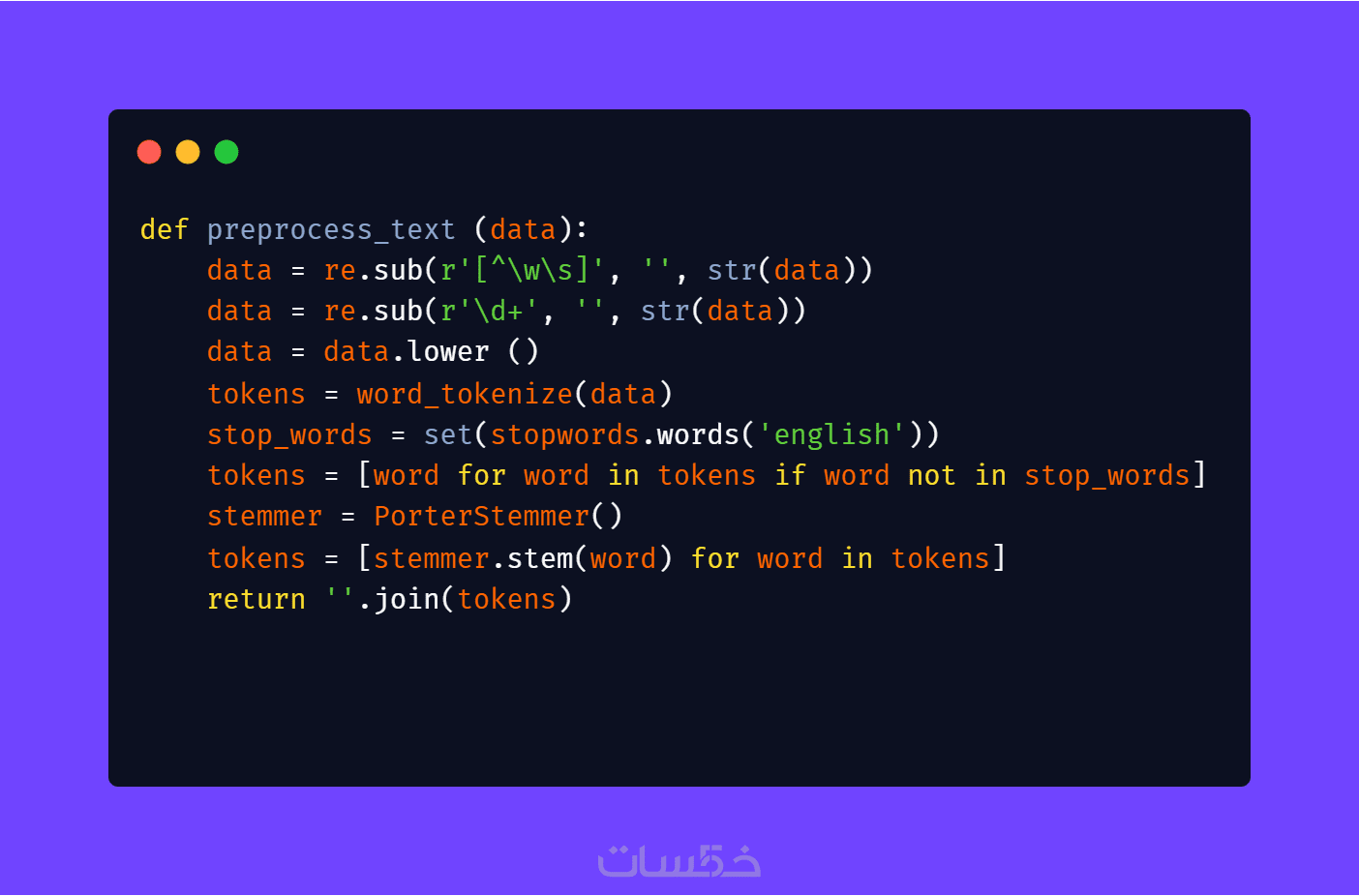 تنظيف البيانات (Pre-processing) واستخراج الكلمات المفتاحية.
