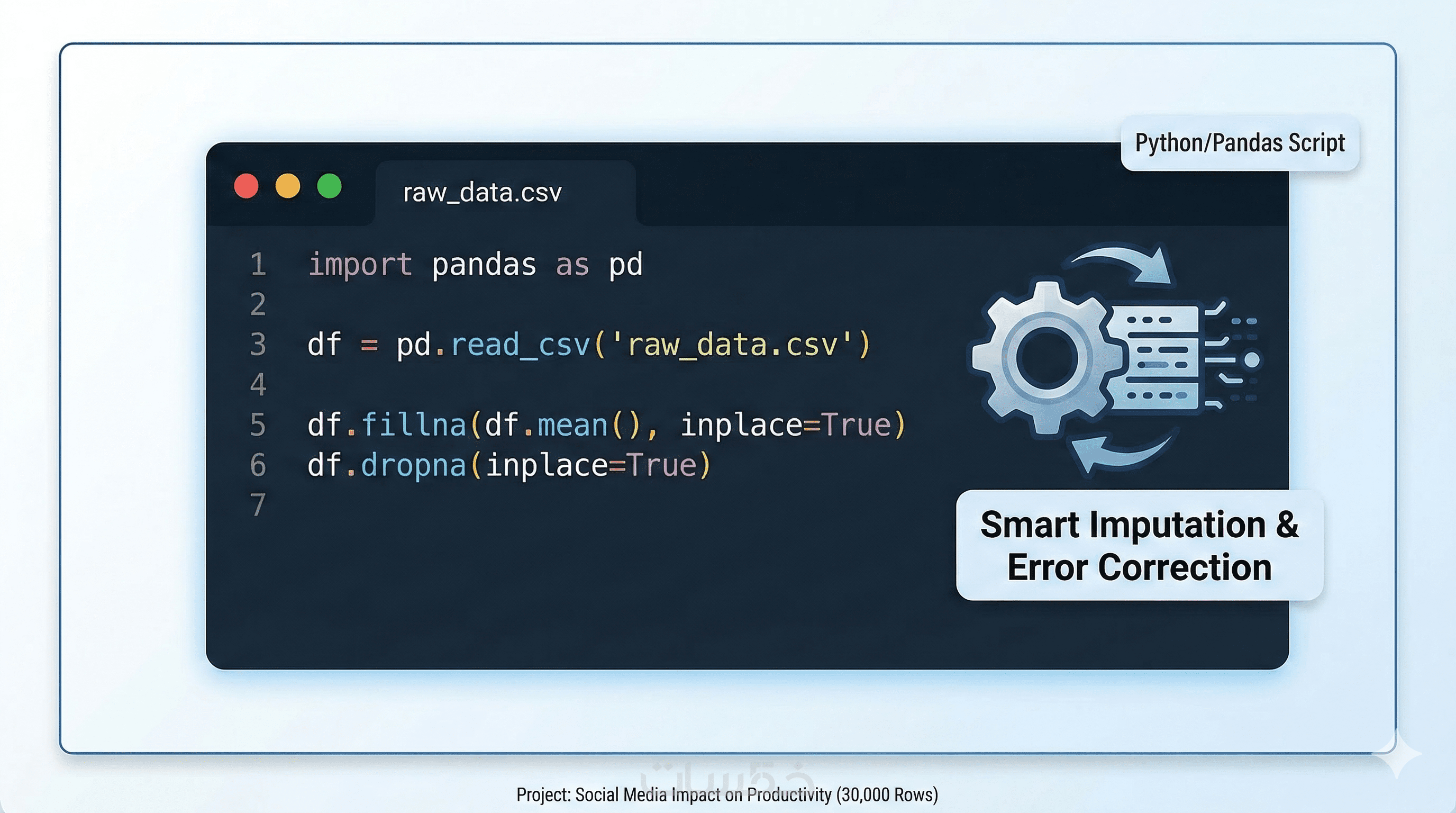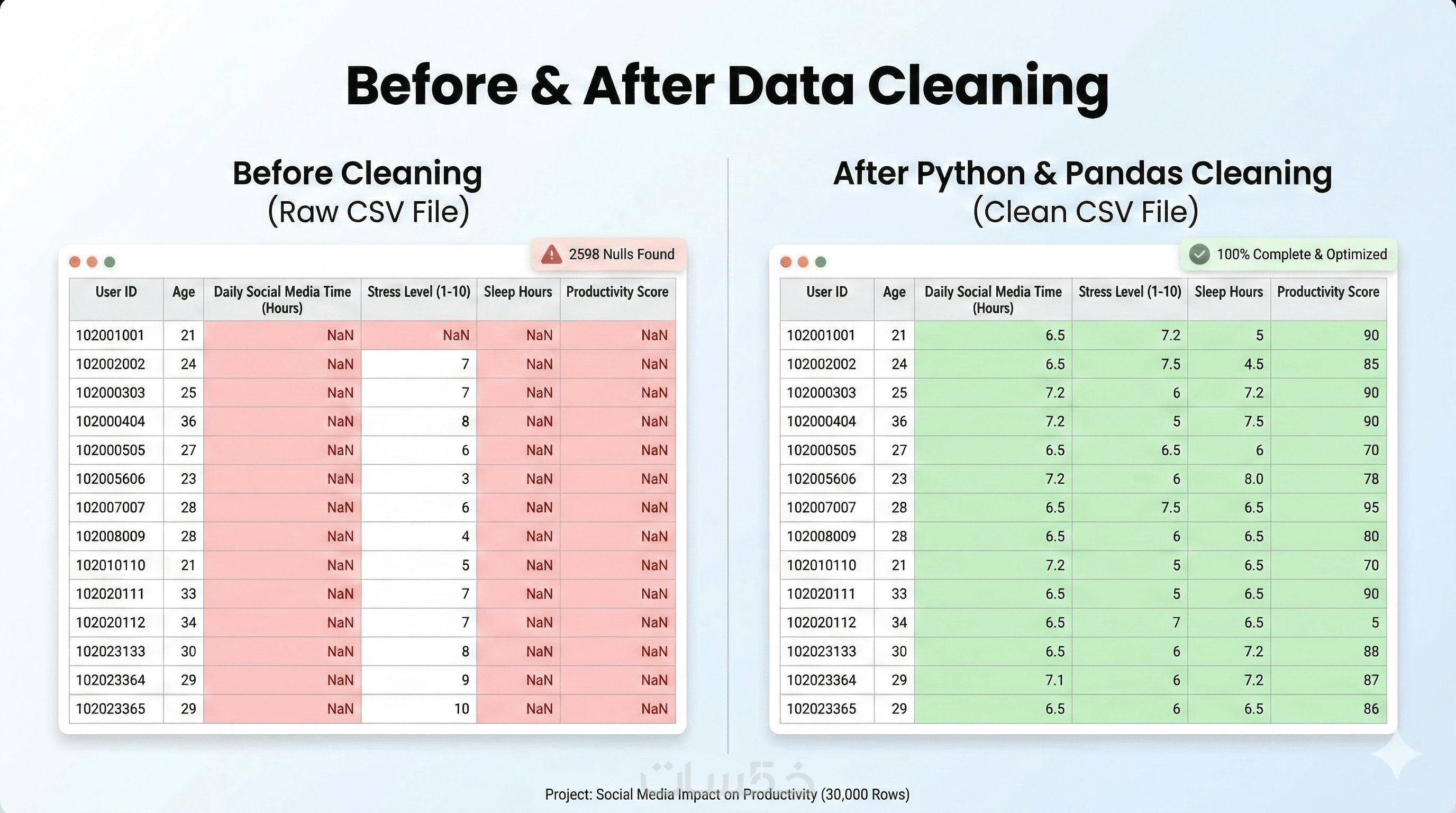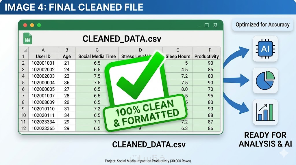 ستستلم ملفاً نظيفاً تماماً ومنظماً (Cleaned Dataset)، مع تقرير إحصائي موجز يوضح أهم العمليات التي تمت برمجياً.