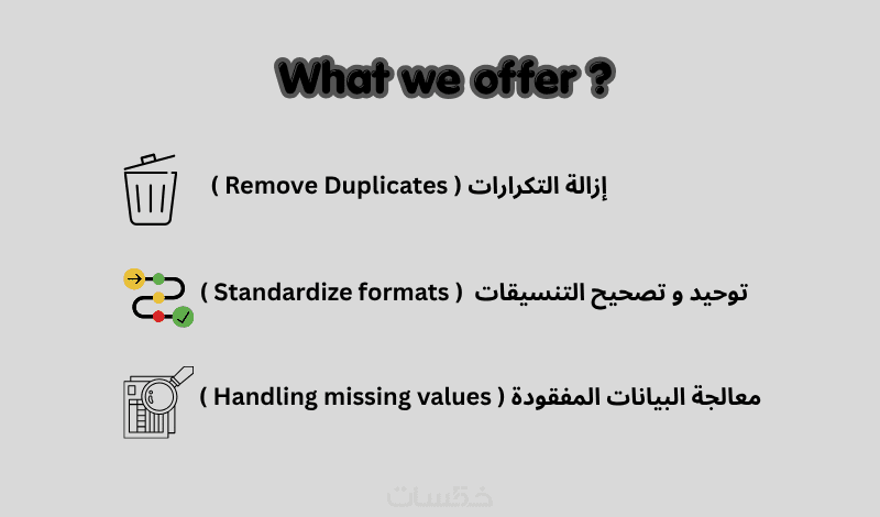 هل تعاني من بيانات فوضوية، مكررة، أو غير مكتملة تعيق قدرتك على تحليلها أو استخدامها؟ البيانات النظيفة هي الأساس لاتخاذ قرارات صحيحة وتقارير دقيقة.