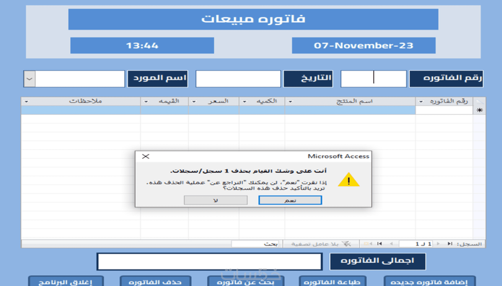 4- امكانيه حذف الفاتوره بجميع اصنافها من خلال الزر الخاص بالحذف