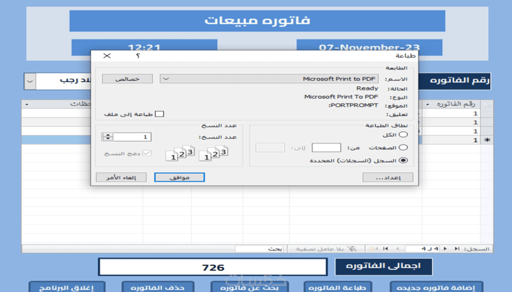2 - طباعه الفاتوره بعد ادخال اصنافها بأى عدد من النسخ من خلال الزر الخاص بالطباعه