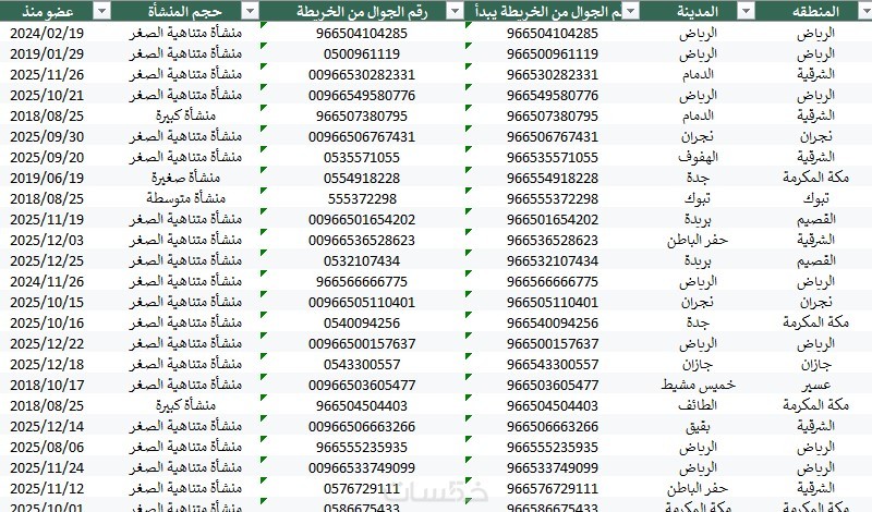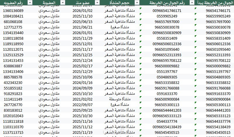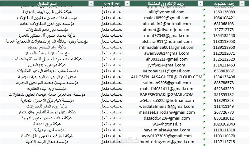 بيانات مقاولين سعوديين من موقع مقاول السعودي بملف اكسيل وتم سحبها بتاريخ 6 يناير 2026 وهذه البيانات تشمل :