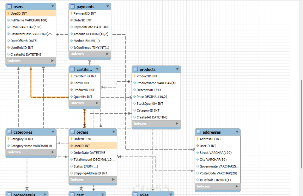 رسم تخطيطي لقاعدة البيانات و الجداول و العلاقات بينها