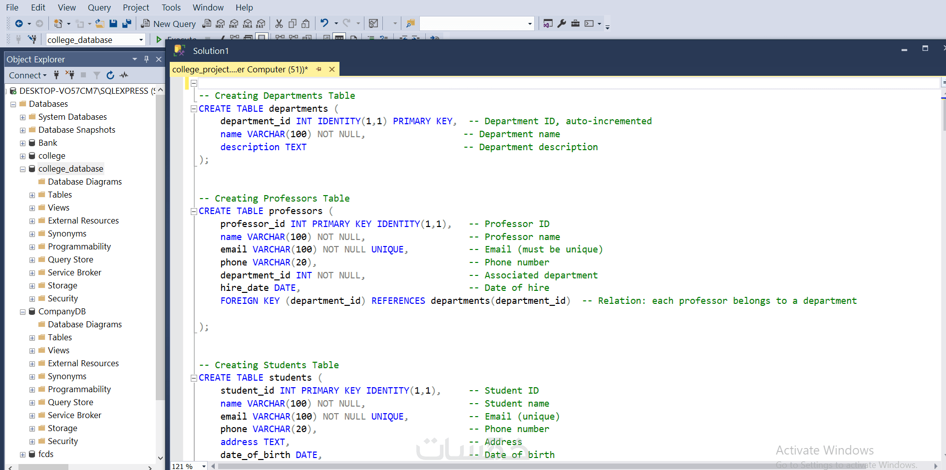 مقدم الخدمة بيعرض إنشاء قاعدة بيانات كاملة باستخدام SQL Server، تشمل تصميم الجداول (Tables) والعلاقات (Relationships)، تحديد المفاتيح الأساسية (Primary Keys) والخارجية (Foreign Keys)، كتابة الاستعلامات (SELECT, INSERT, UPDATE, DELETE).