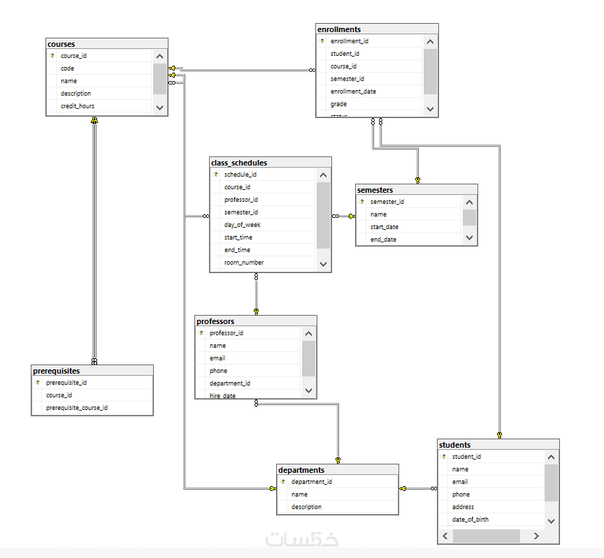 رسم توضيحي يبين العلاقات بين الجداول ليسهل فهم النظام.