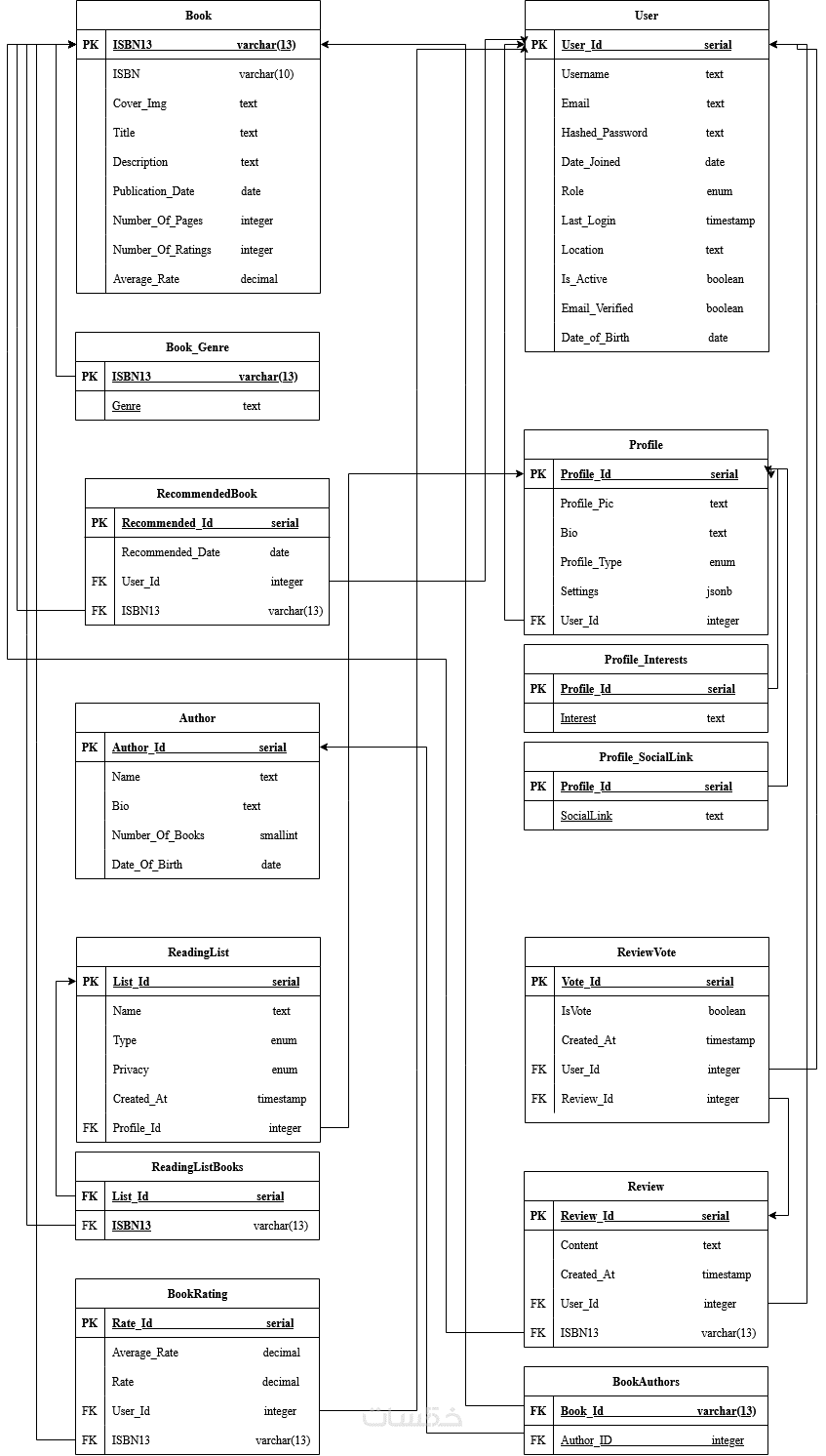 إنشاء الجداول والعلاقات (Tables & Relations) حسب المخطط.