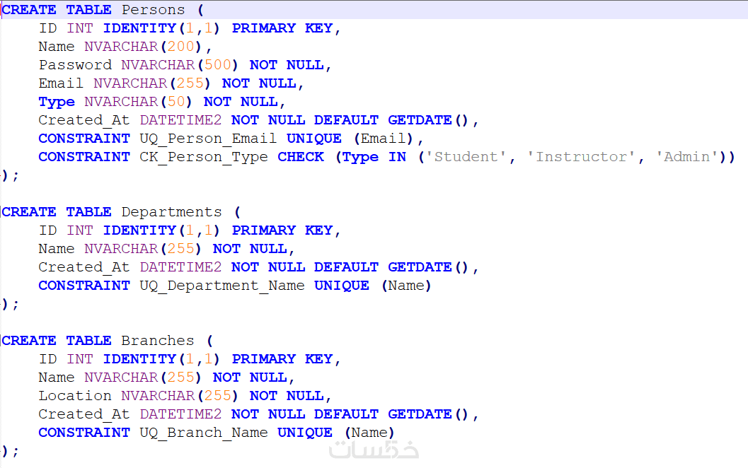 تعريف القيود (Primary / Foreign Keys – Constraints).