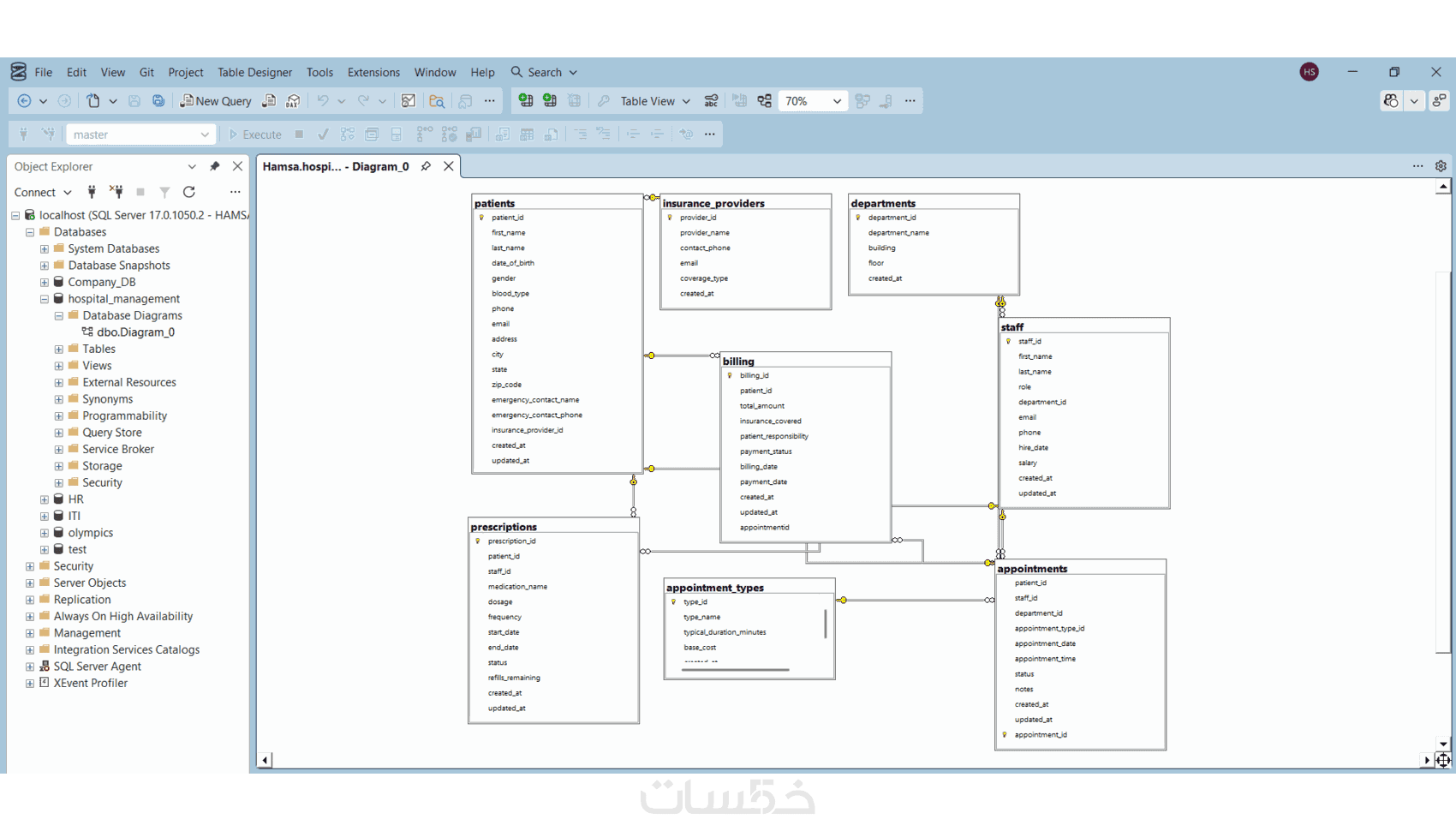 - بناء 5 جداول: إنشاء الجداول بتنسيق احترافي مع ضبط أنواع البيانات والقيود (Constraints) في MS SQL Server.