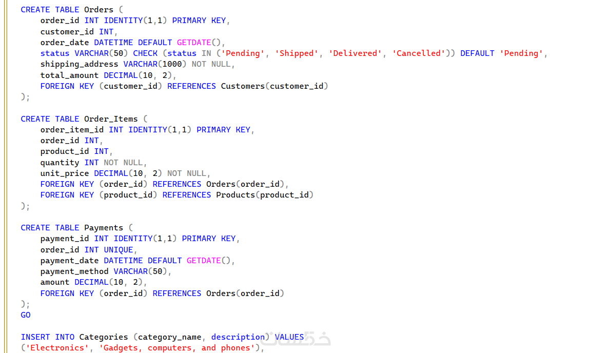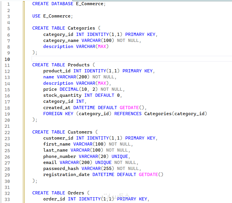 كتابة كود إدخال 10 صفوف بيانات تجريبية (INSERT) لكل جدول.