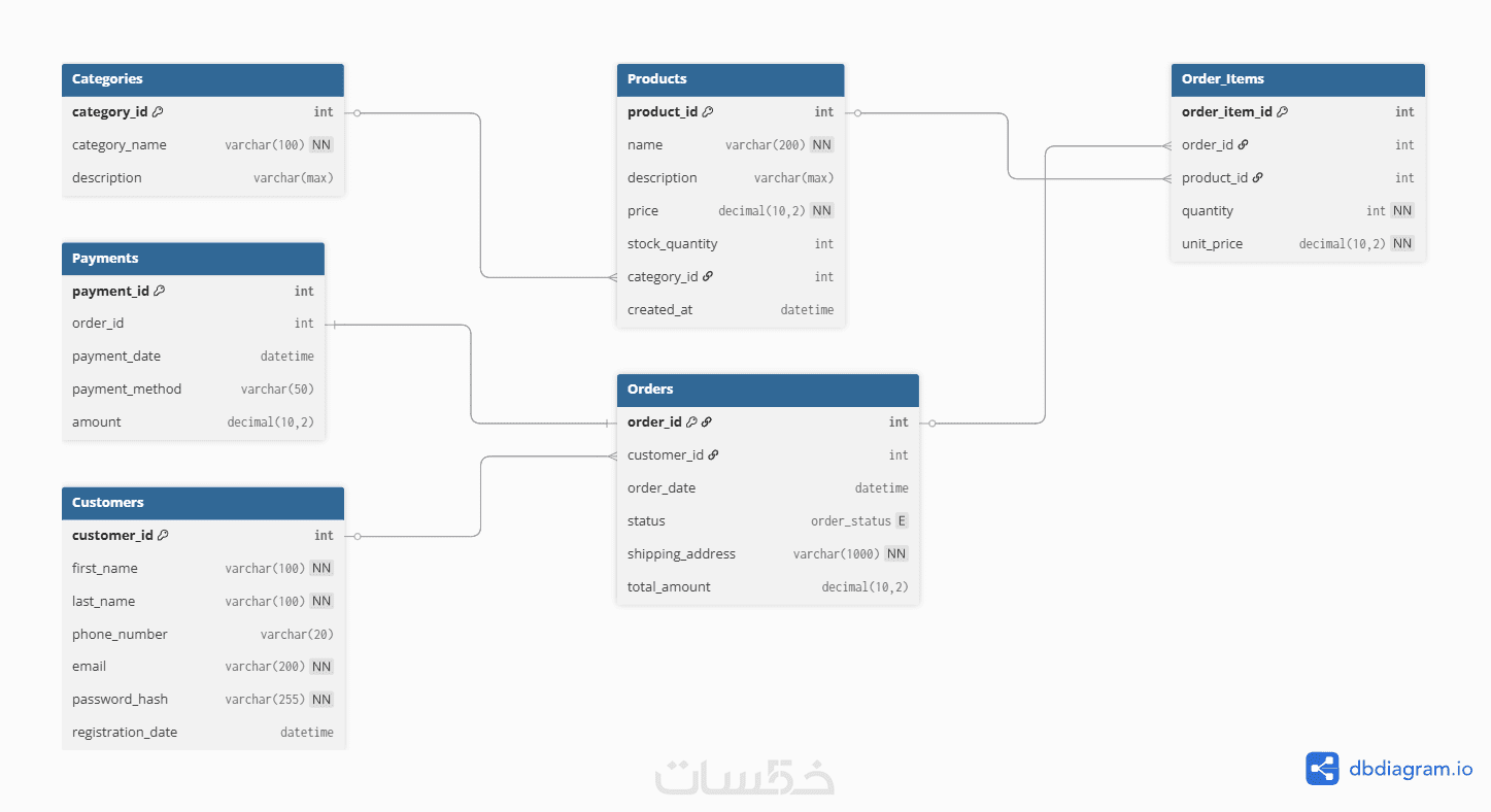 رسم مخطط الكيانات والعلاقات (ERD): تصميم مخطط احترافي يوضح هيكلية البيانات باستخدام أدوات مثل (dbdiagram).