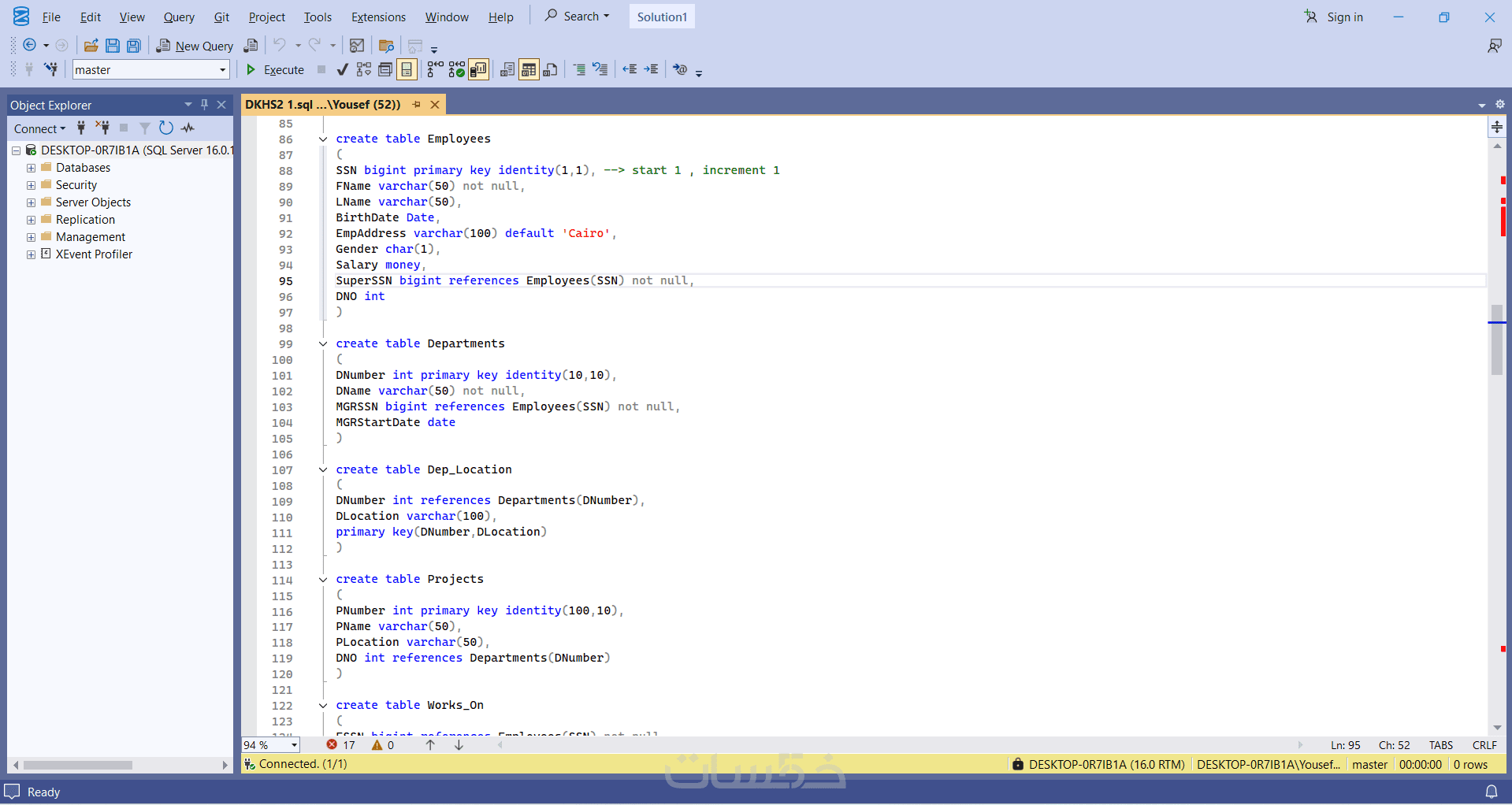 أقدم لك تصميم قاعدة بيانات احترافية على SQL Server تساعدك على إدارة بياناتك بسهولة وكفاءة، مع علاقات سليمة بين الجداول وقابلية التوسع مستقبليًا
