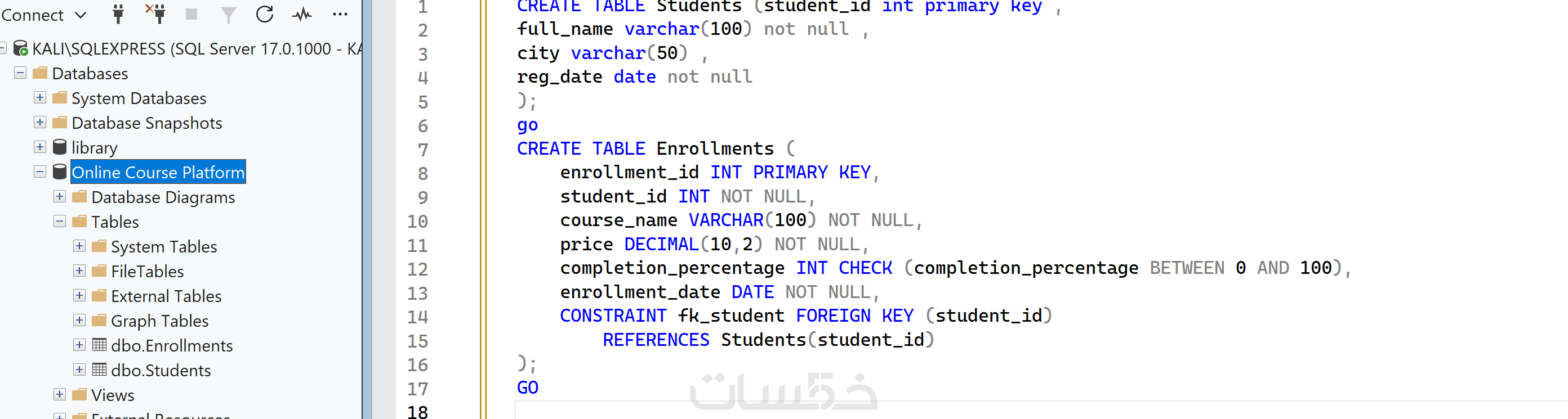 ملف يحتوي على أوامر إنشاء الجداول والعلاقات والقيود (CREATE TABLE + Keys) جاهز للتشغيل مباشرة.