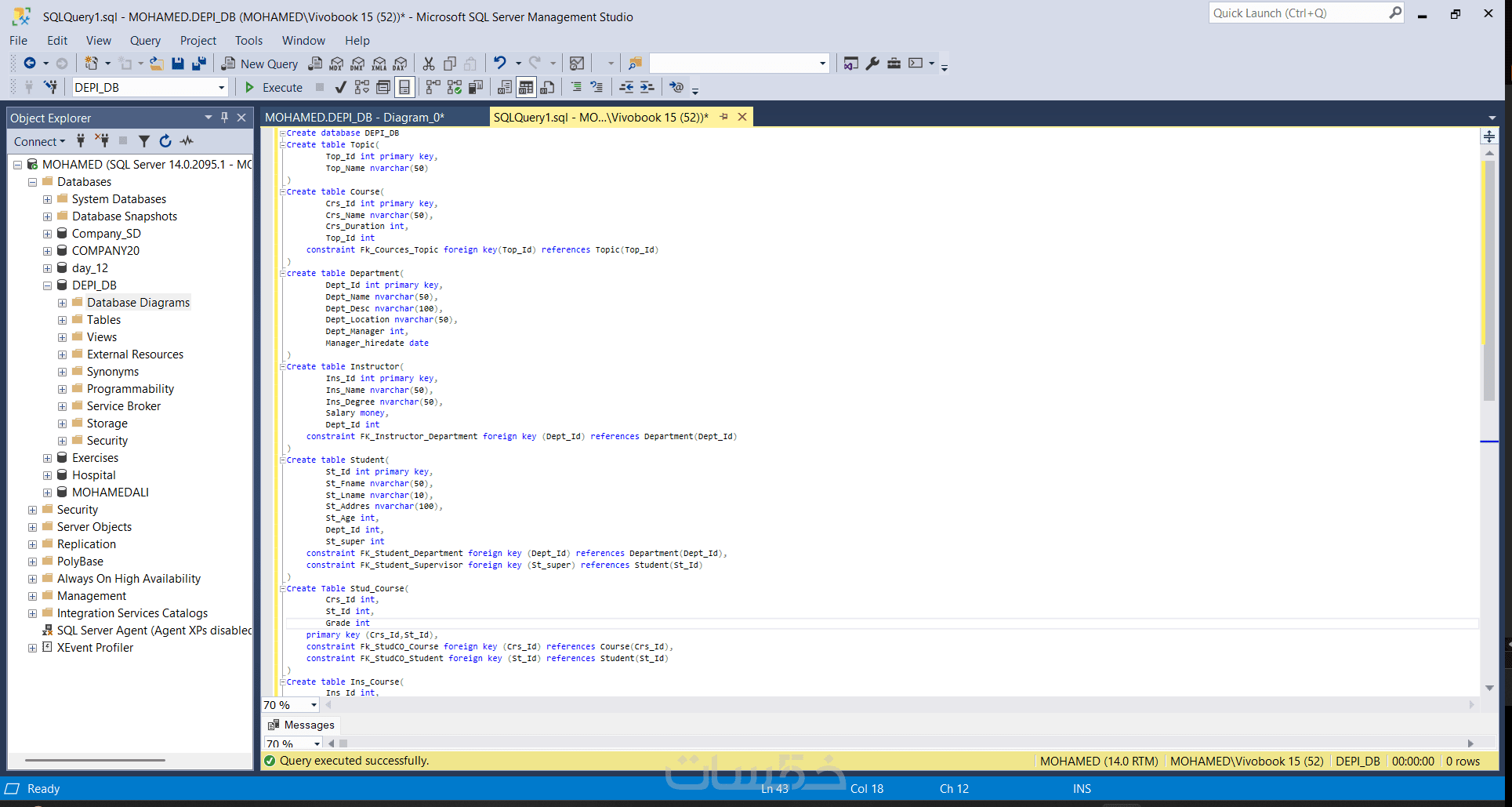 بناء الجداول (Tables) وتحديد العلاقات (Constraints & Keys) بناءً على المخطط المقدم.