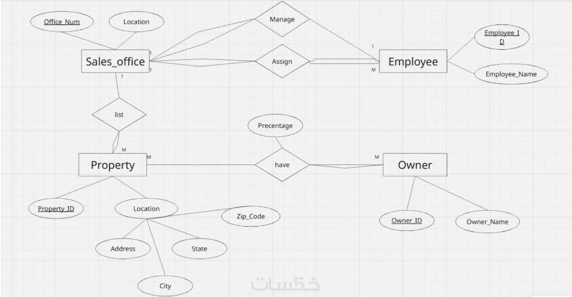 رسم احترافي يوضح الكيانات (Entities) والعلاقات (Relationships) بينها.