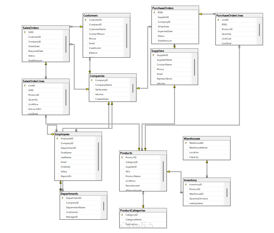 تصميم قاعدة بيانات متقدمة تحتوي على (من 21 إلى 30 جدولاً كحد أقصى) شاملة مخطط ERD وملف SQL