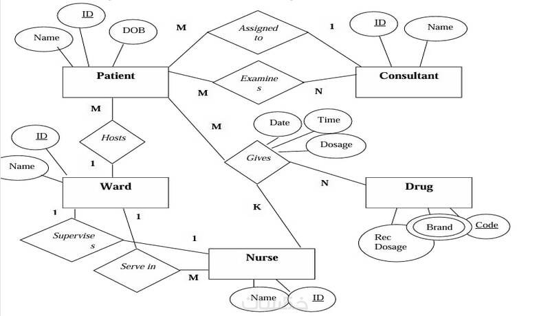 نظام إدارة مستشفى: يشمل المرضى، الأطباء، الممرضين، الأقسام، والأدوية مع تنظيم العلاقات بينهم بدقة