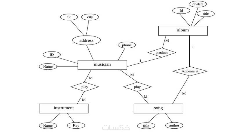 نظام شركة إنتاج موسيقي: يشمل الموسيقيين، الآلات، الألبومات، الأغاني، والمنتجين مع تنظيم العلاقات بينهم