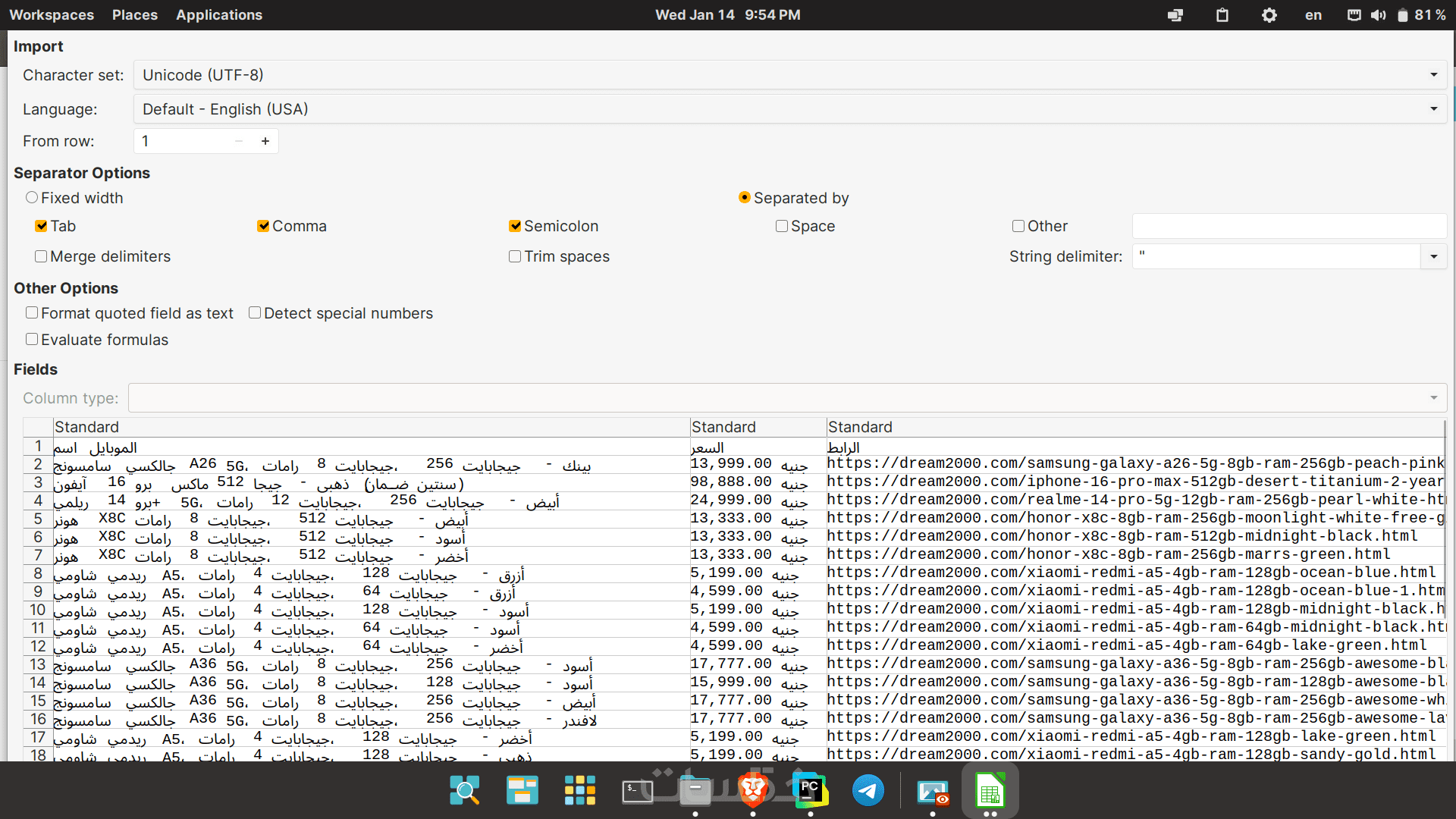 تنظيم البيانات: البيانات ستكون مرتبة في أعمدة واضحة (على سبيل المثال: الاسم، الوصف، السعر، رابط الصورة، التقييم).