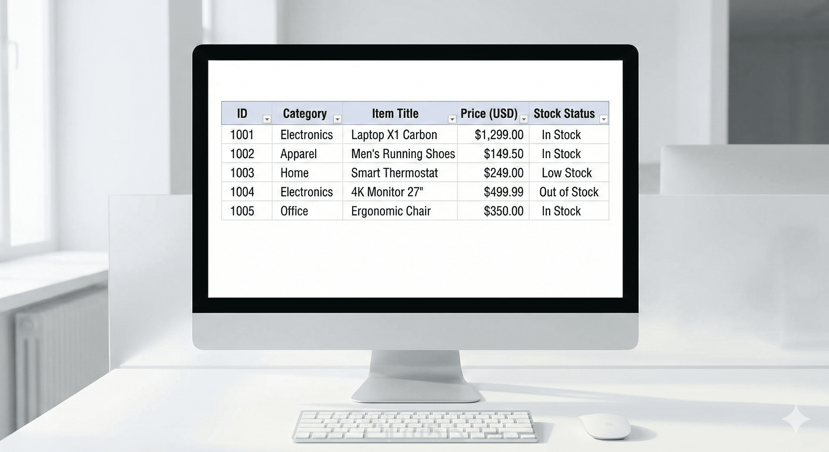 ملف Excel (xlsx) أو CSV مرتب بعناية، حيث كل معلومة في عمودها الصحيح (الاسم، السعر، الرابط)، جاهز للفلترة والترتيب مباشرة.