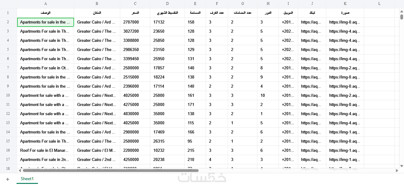 - أمثلة على البيانات التي يمكن استخراجها: أسماء المشاريع/المواقع، الوحدات المتاحة وتفاصيلها، عدد الغرف/الحمّامات (إن وُجد)، المساحة، روابط الصور مع إمكانية تنزيلها وتجميعها (حسب توفرها)، وأي حقول أخرى ظاهرة بالموقع.