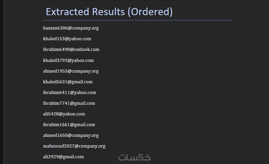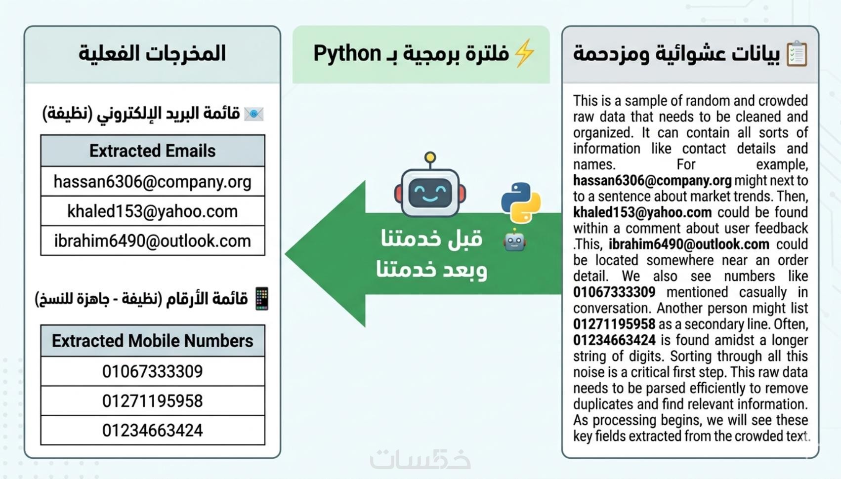الوصف: "ستستلم ملفاً منظماً يحتوي على كافة البيانات المستخرجة (أرقام، إيميلات، روابط) بعد تنظيفها تماماً وتنسيقها لتكون جاهزة للاستخدام الفوري
