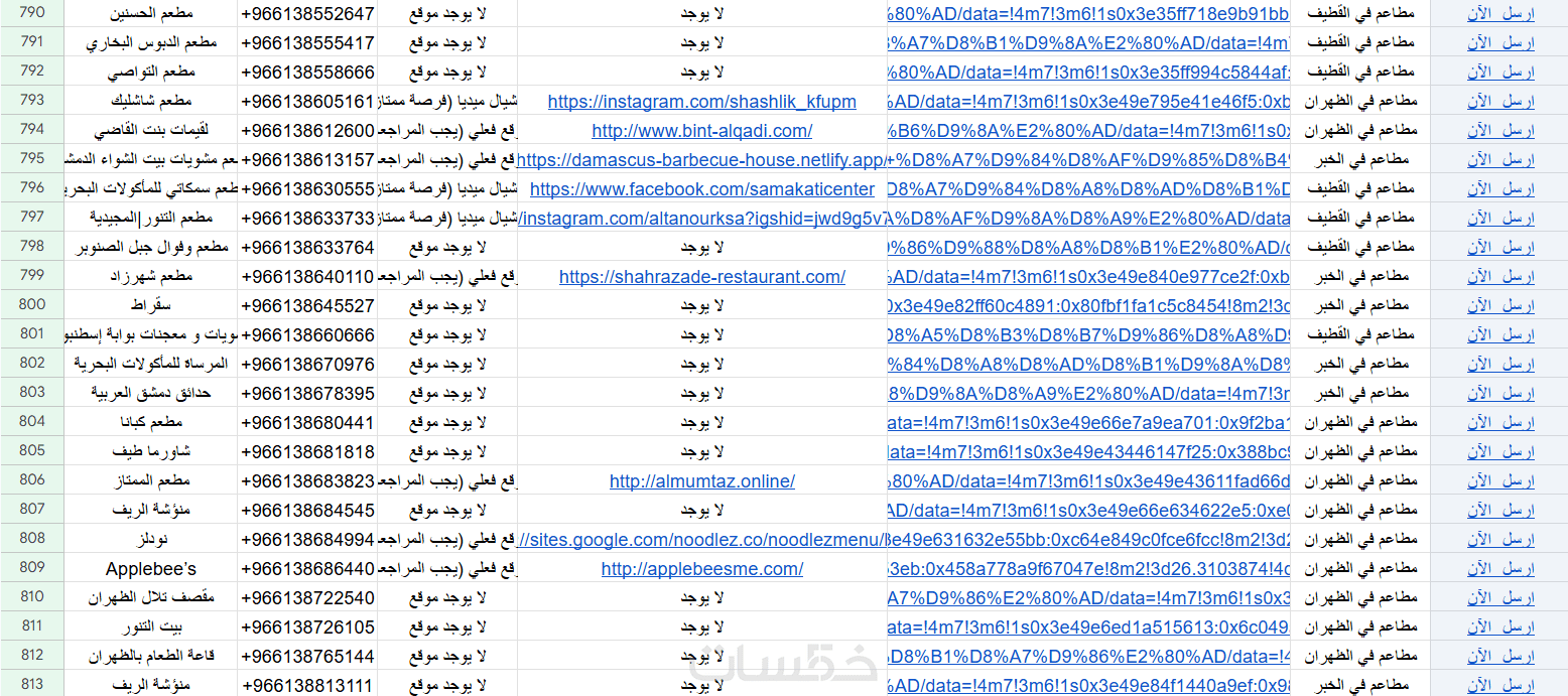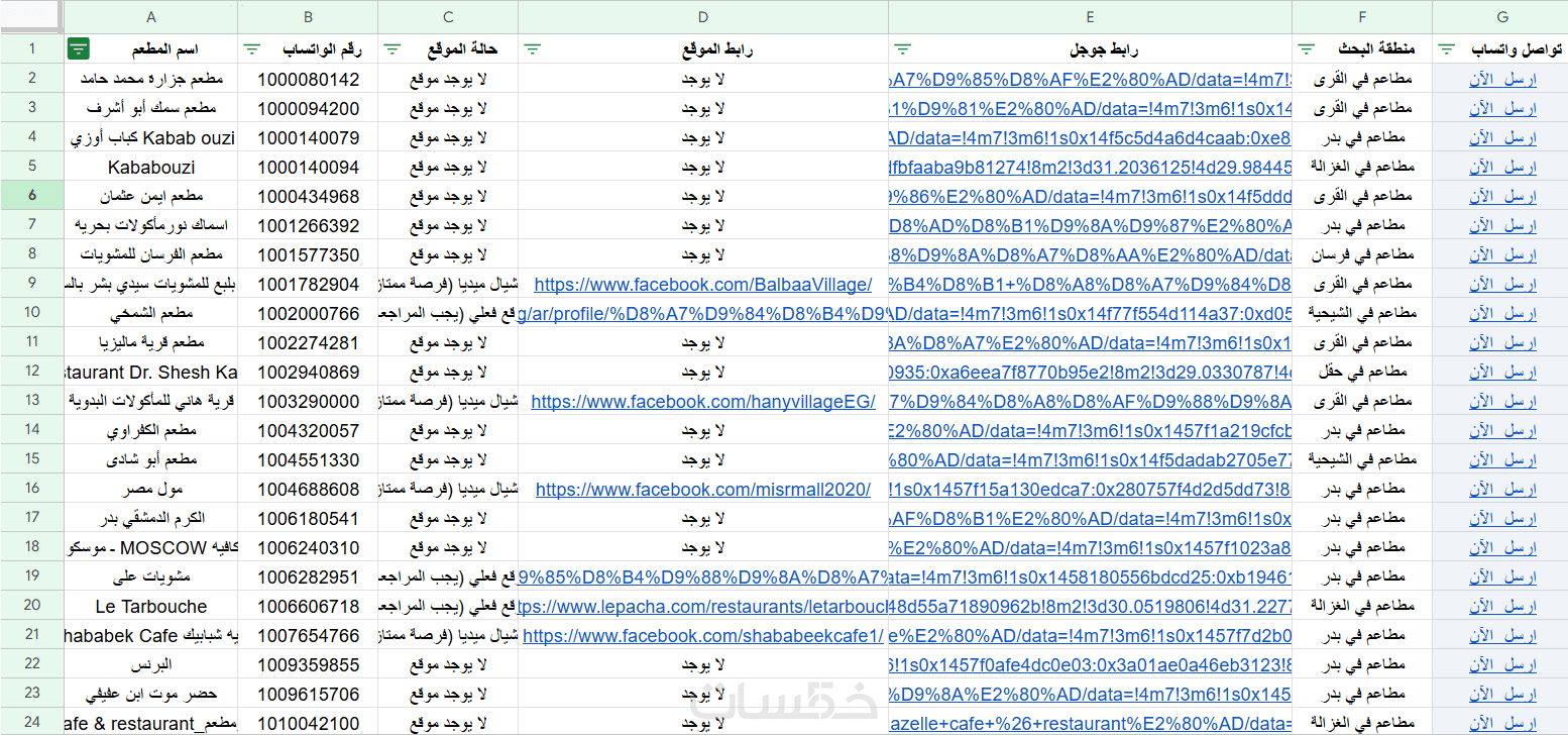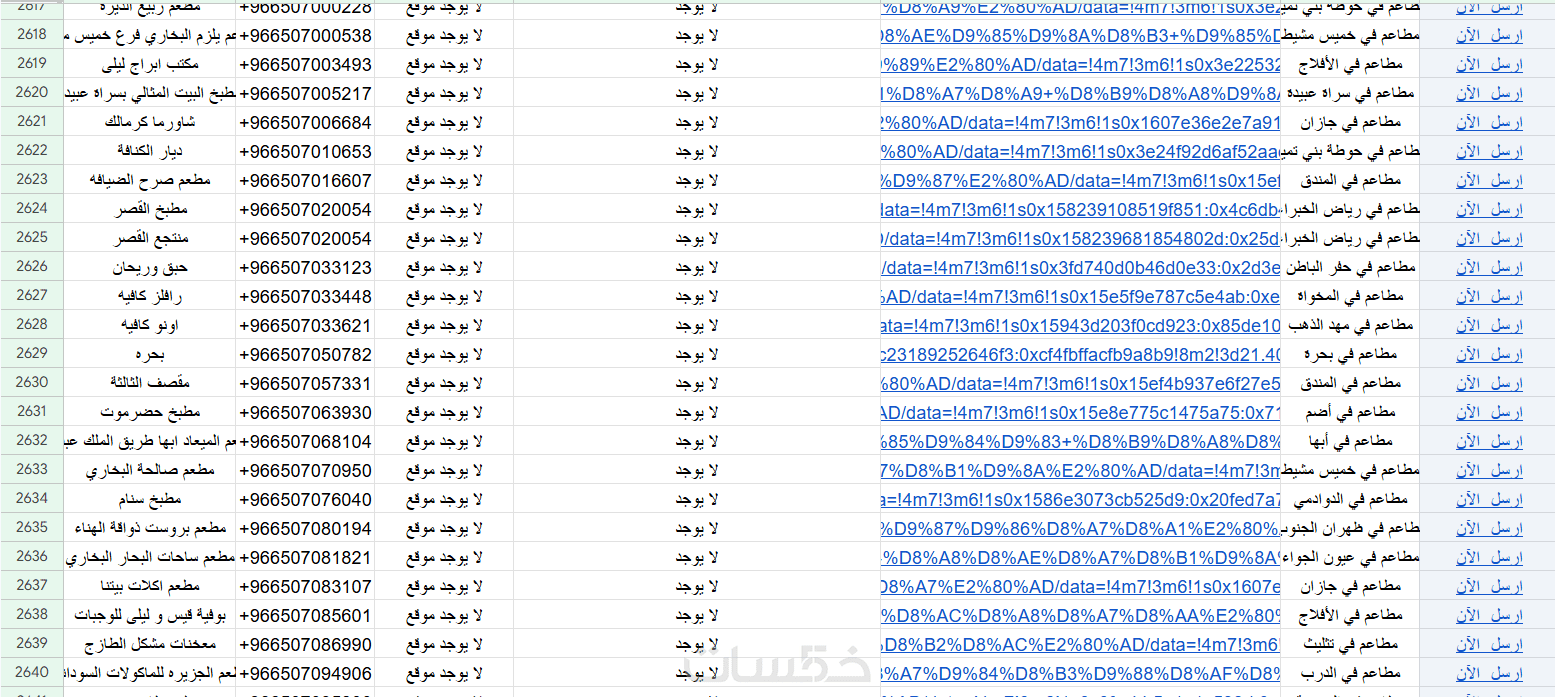 تحتوي البيانات على أرقام الهاتف وواتساب، بالإضافة إلى الموقع الجغرافي عبر Google Maps، وروابط المواقع الإلكترونية إن وجدت، مما يسهل عليك عملية التواصل والاستهداف بشكل مباشر وسريع.