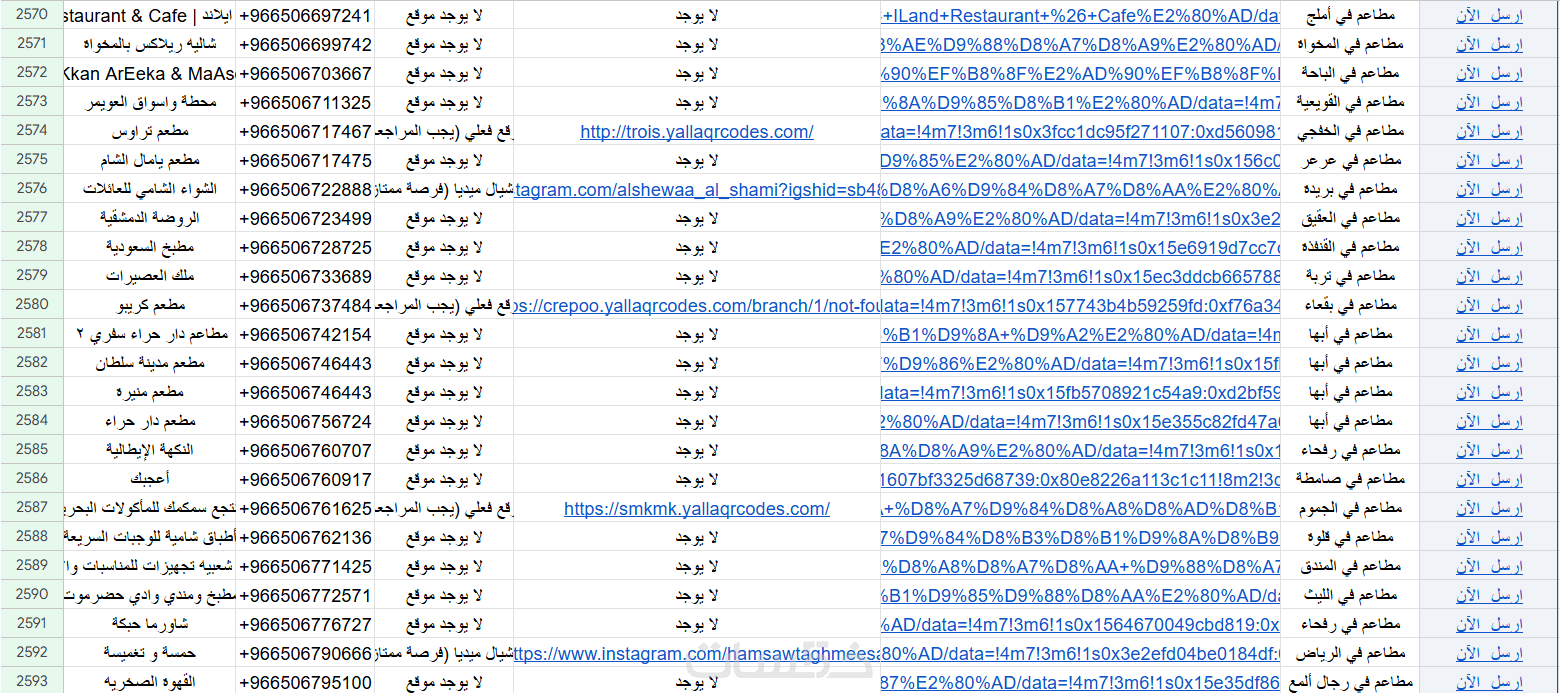 يحتوي على: بيانات مطاعم وكافيهات تشمل أرقام الهاتف وواتساب، روابط الموقع الجغرافي (Google Maps)، وروابط المواقع الإلكترونية إن وجدت، مع تصنيف منظم حسب المدينة (مثل: الرياض – جدة – الدمام – وغيرها)