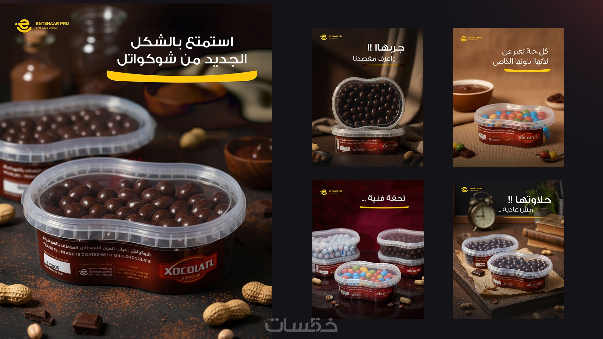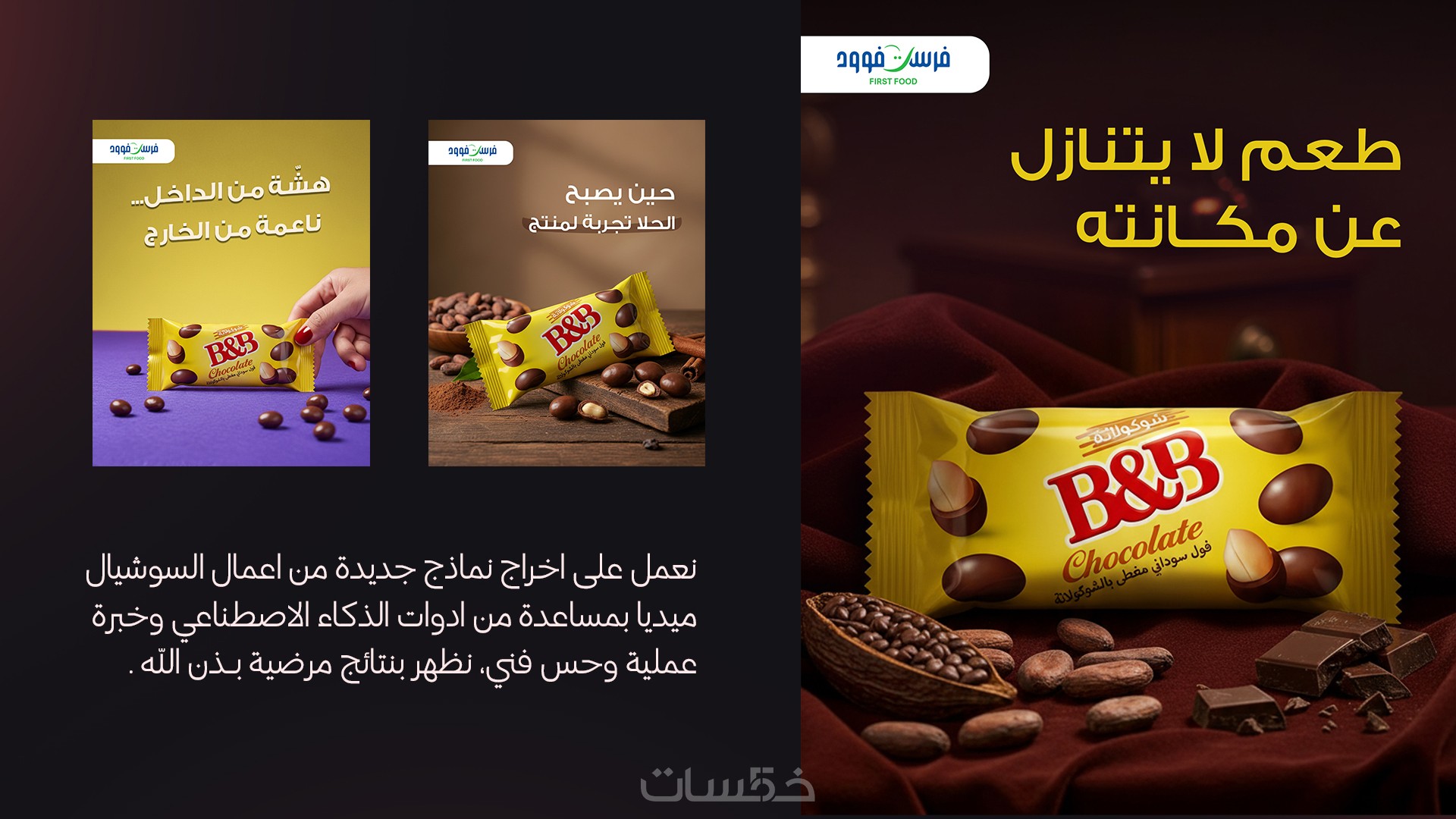 أقدّم لك خدمة تصميم صور منتجات احترافية مخصصة للسوشيال ميديا، مناسبة لعرض منتجات الشوكولاتة وغيرها