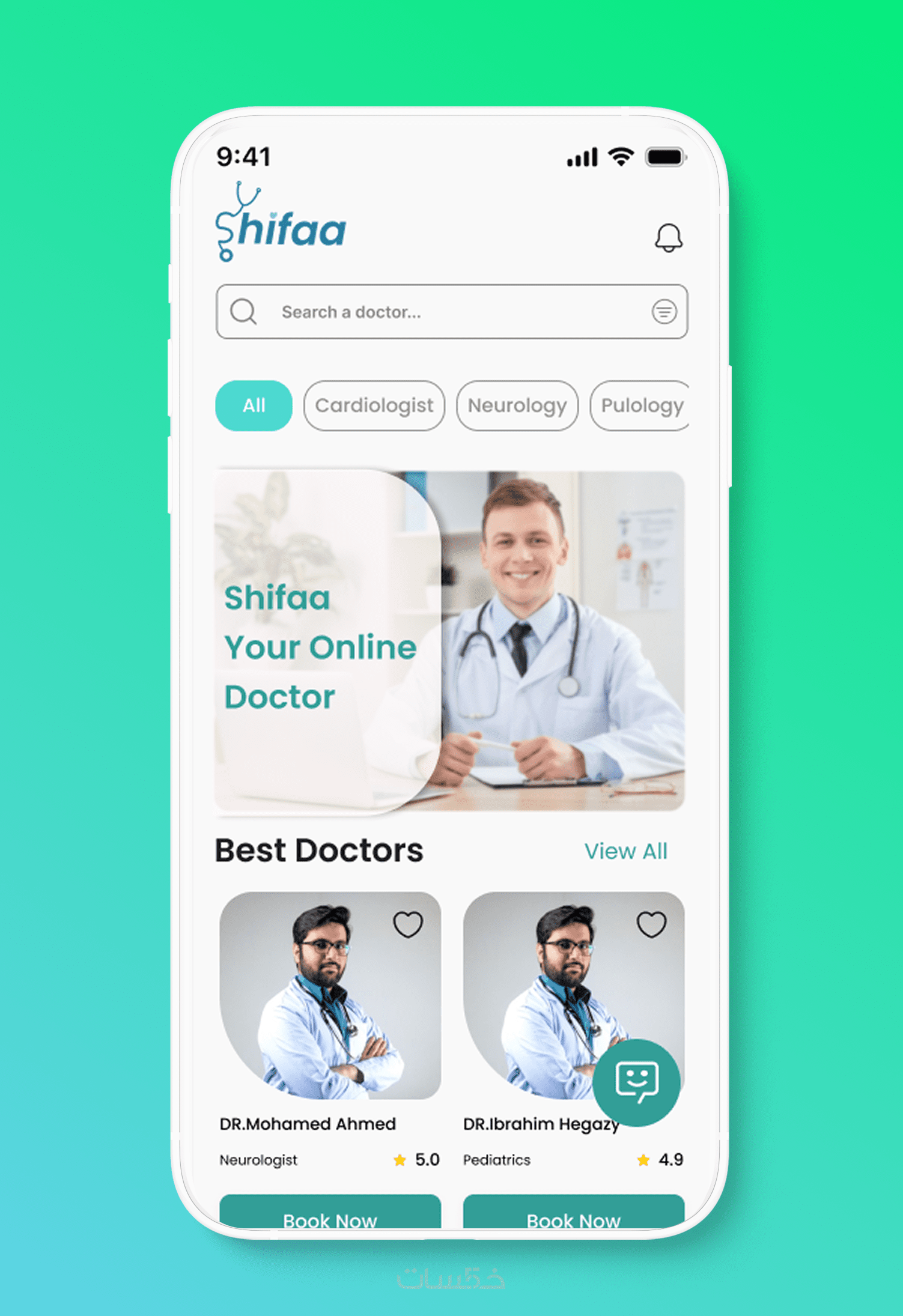 أقدم لك خدمة تصميم واجهات مستخدم (UI) عصرية، تماماً مثل نموذج تطبيق "Shifaa" المرفق، مع التركيز الكامل على تجربة المستخدم وسهولة التصفح.