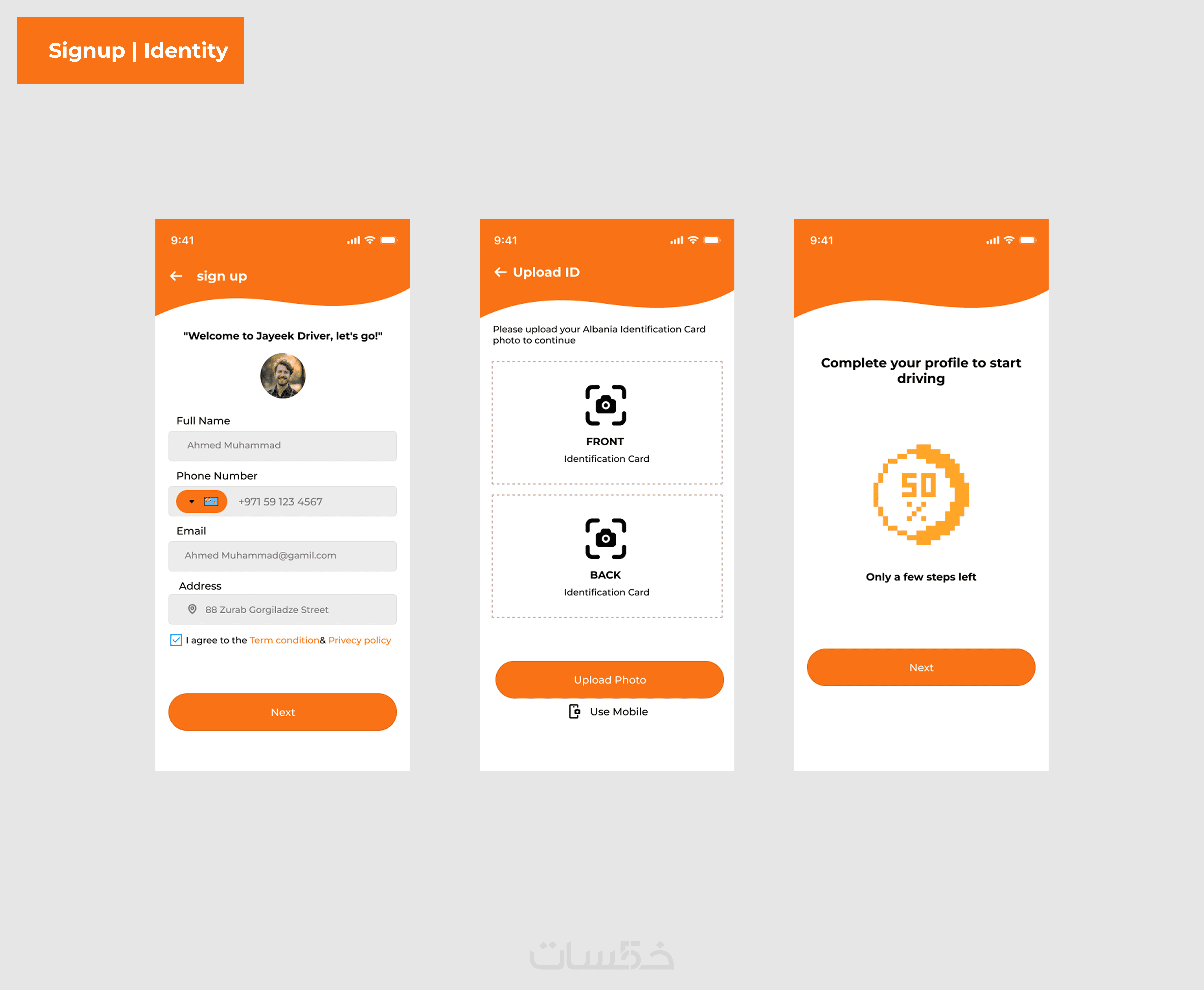 التصاميم النهائية: جميع الشاشات (Splash, Onboarding, Login, Signup, Identity, Vehicle Info)