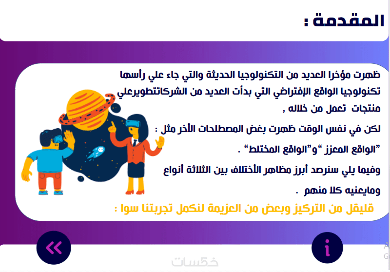 دمج تقنيات التعليم الحديثة مثل الواقع المعزز (AR)، الواقع الافتراضي (VR)، والواقع المختلط (MR).