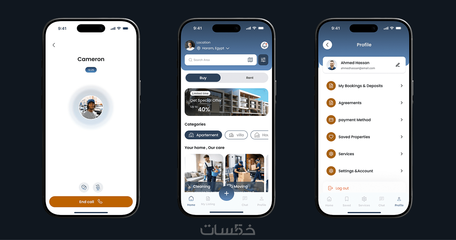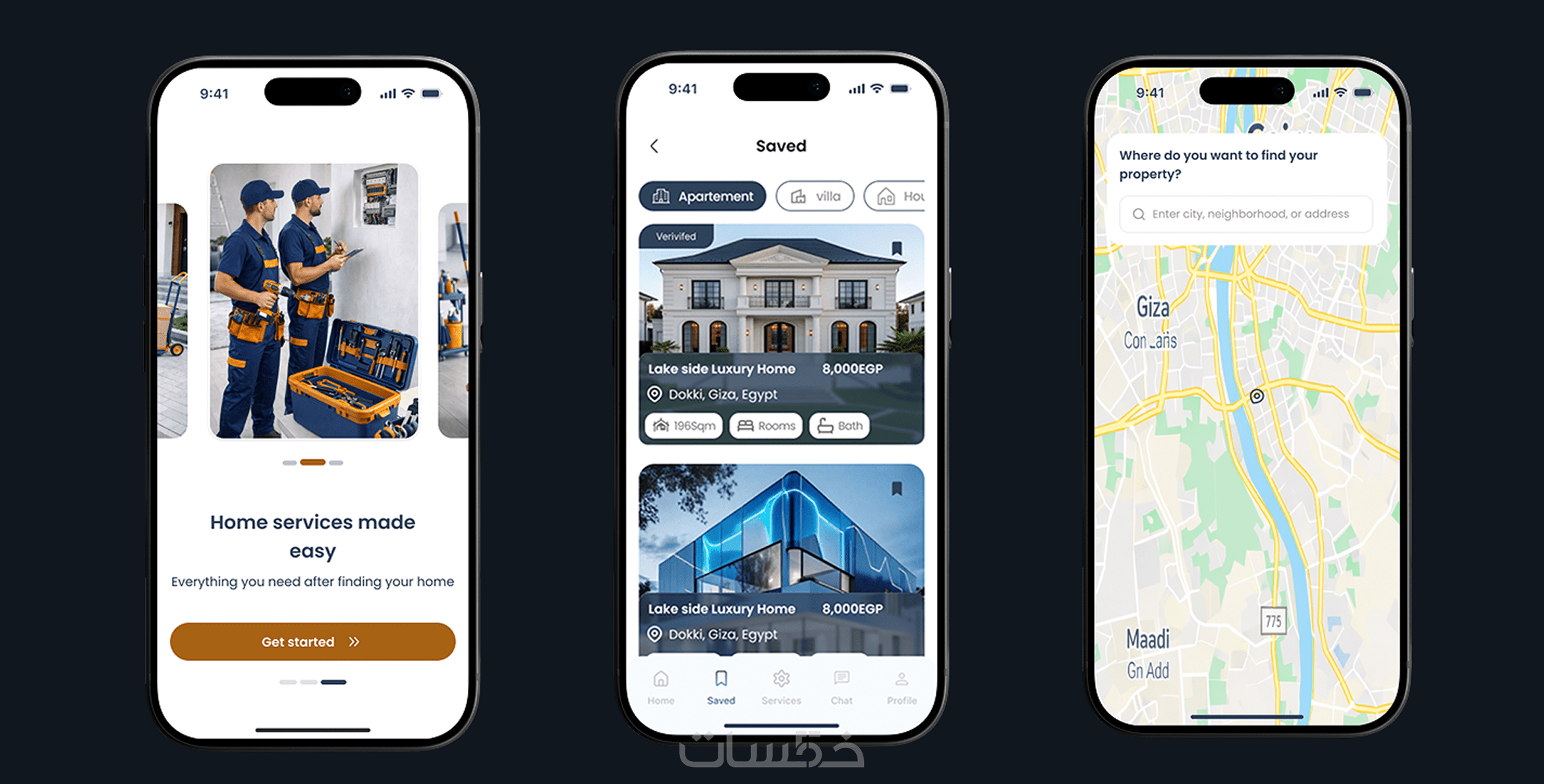 أقدّم لك تصميم واجهة وتجربة مستخدم لتطبيق عقارات احترافي يشمل البيع والإيجار، مع خدمات متكاملة مثل الصيانة، التنظيف، والنقل. التطبيق مصمّم ليكون سهل الاستخدام وجذاب للمستخدم، مع حماية كاملة لبيانات العملاء لضمان الأمان والثقة.