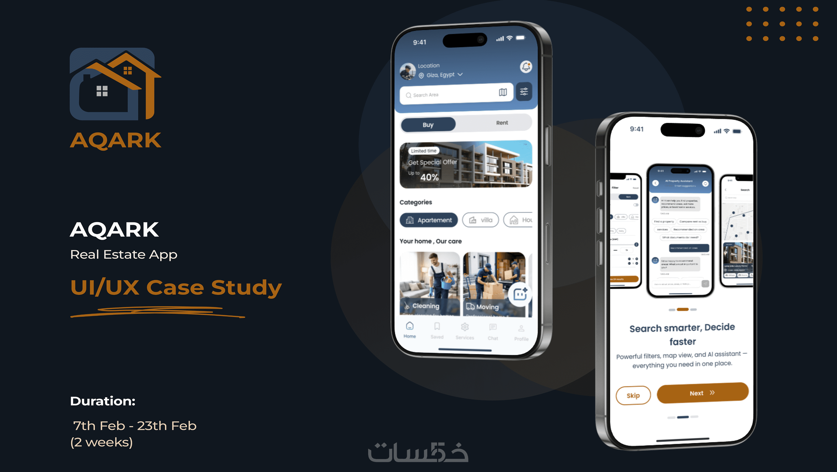 كما يتضمن التطبيق نظام محادثة ذكي بالذكاء الاصطناعي يساعد المستخدمين على الاستفسار والحصول على إجابات سريعة وفعّالة، مما يجعل تجربة البحث عن العقارات والخدمات أكثر سهولة وسلاسة.
