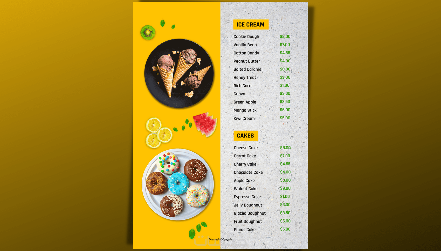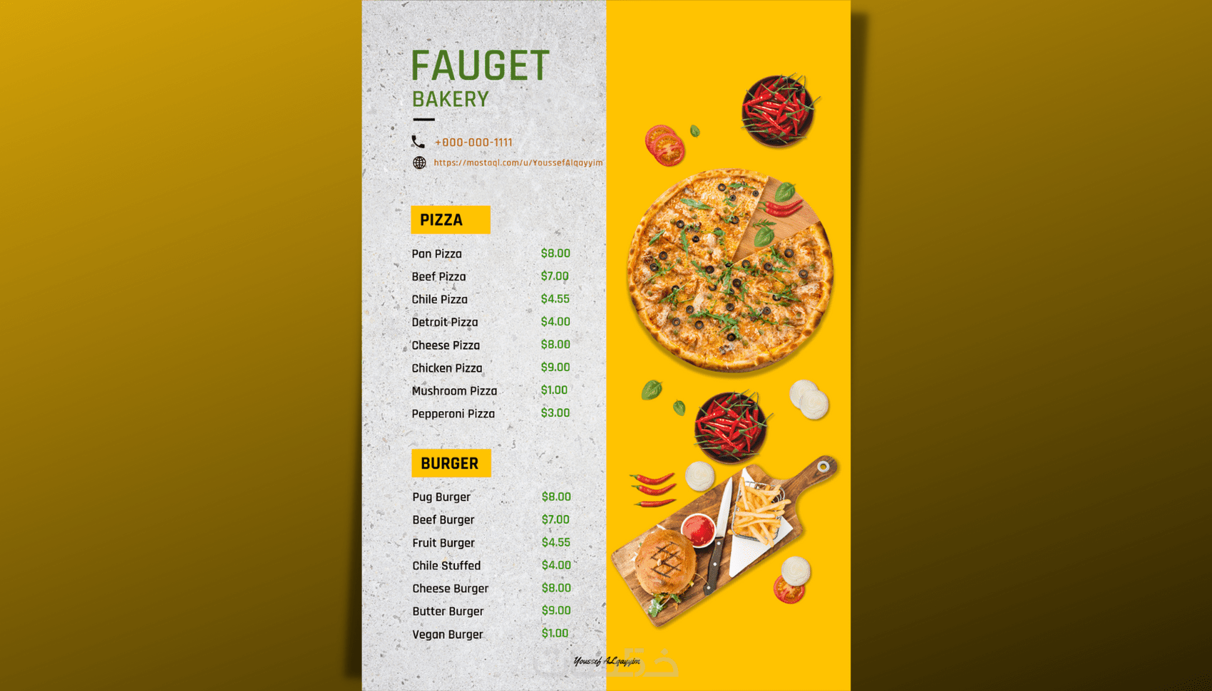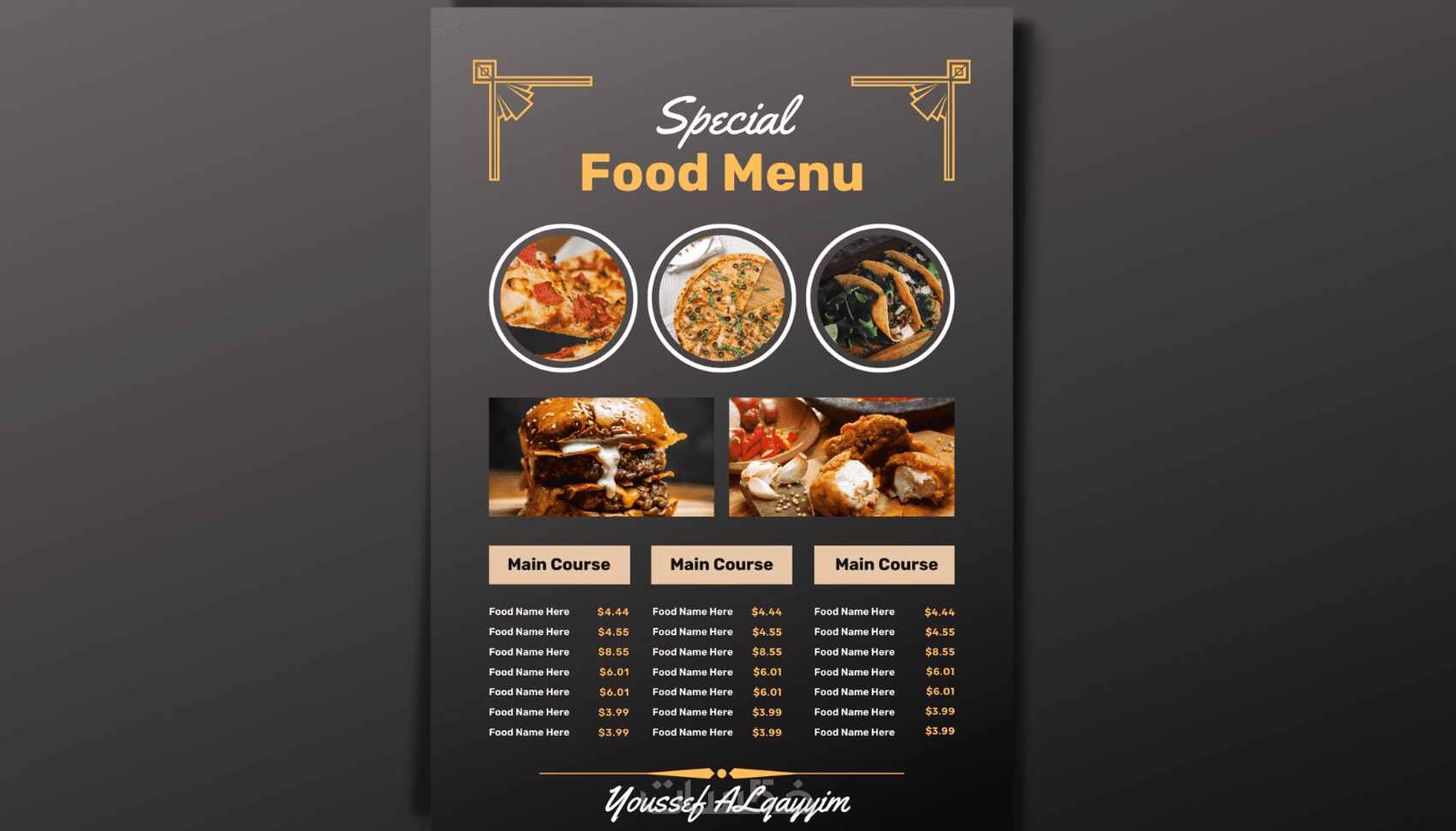 مرحبا انا يوسف , اهلاً وسهلاً بكم في خدمتي لتصميم منيو مطاعم وهذا جزء من تصميمي لمجموعه من المنيو لمطاعم مختلفة مع امكانية اضافة والتعديل بشكل غير محدود وهذا جزء بسيط من أفكاري حيث أتقن العمل بفضل الله على جميع أنواع التصاميم وحسب المواصفات المطلوبة.