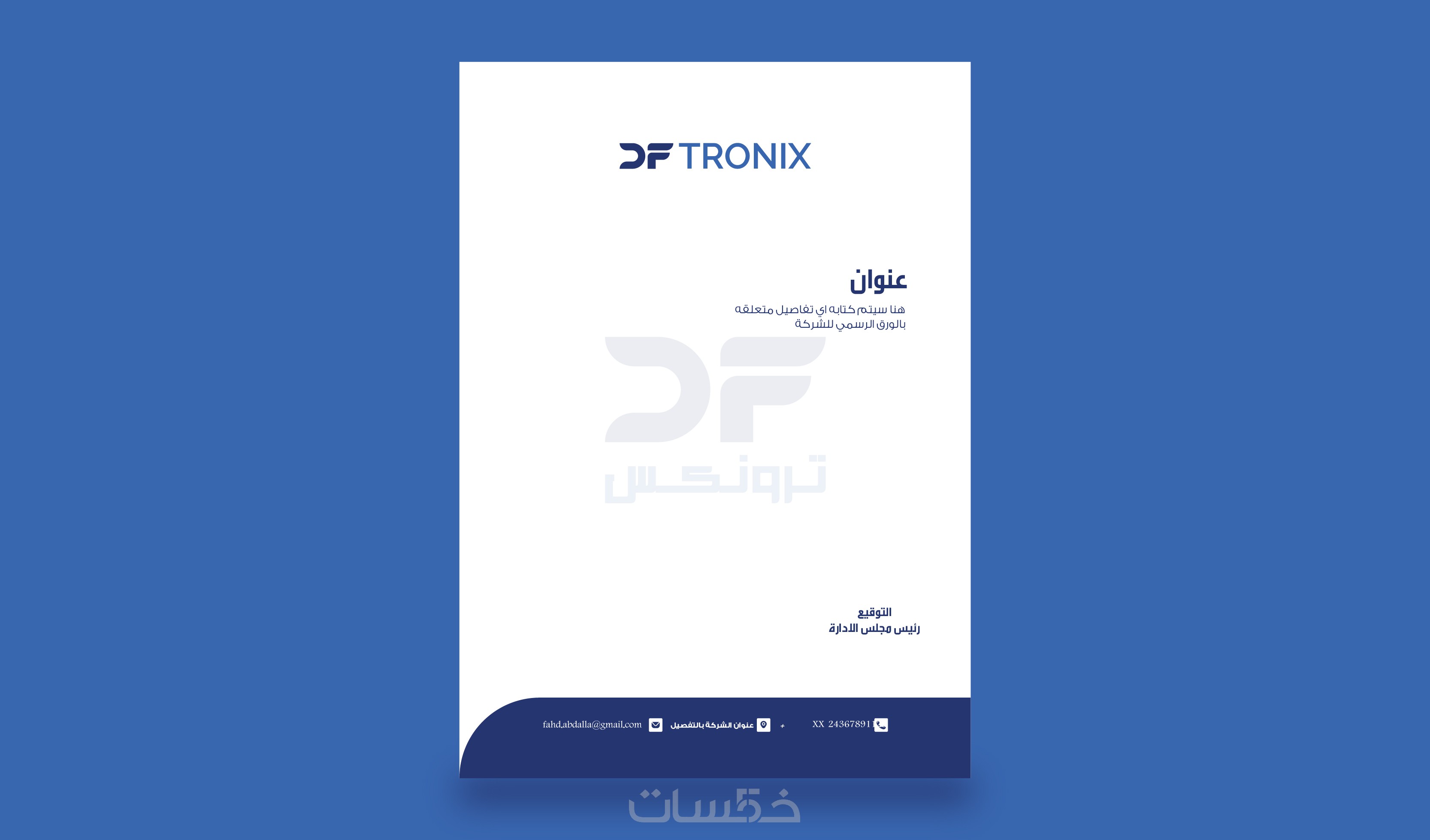 - يشمل معلومات التواصل والشعار بطريقة منظمة وواضحة