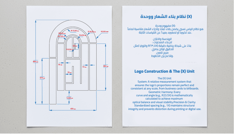 نظام البناء الهندسي (Grid System): تقديم الشعار مبنياً على شبكة رياضية دقيقة (The X Unit) تضمن توازن الأبعاد والاحترافية البصرية.
