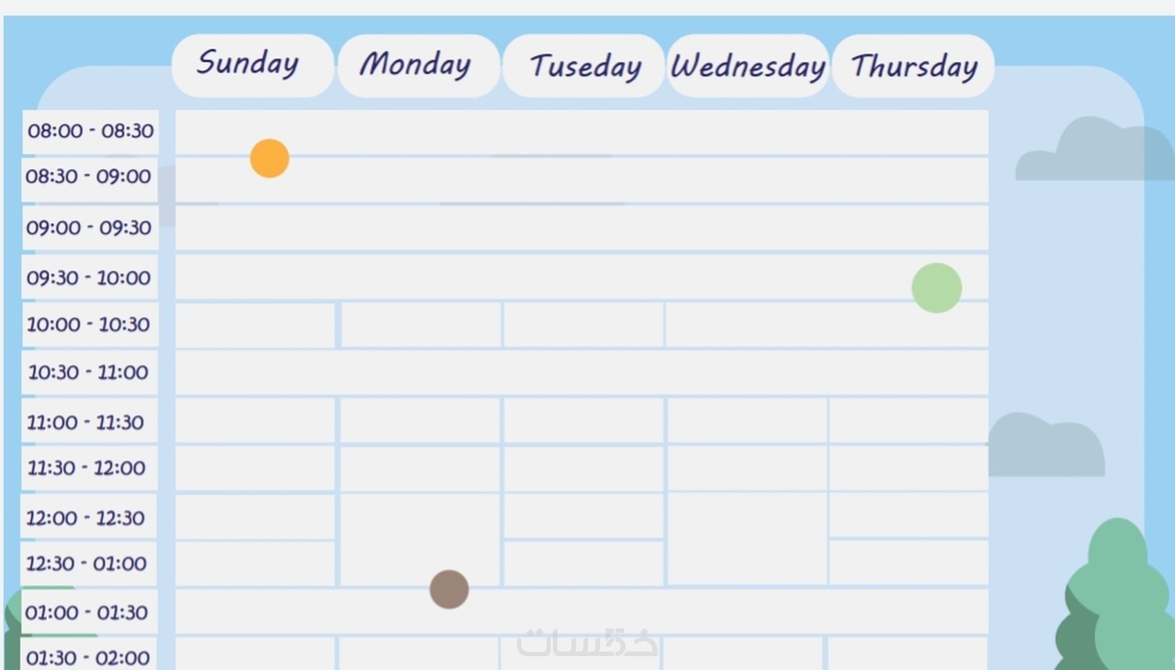 تصميم جدول حصص بالتوقيت لمده اسبوع خاص الحضانات أو المدارس أو الجهات التعليميه ، تصميم خلفيه الجدول بتقنيه وجوده عاليه وتفيد في عرض المحتوي التعليمي بشكل أفضل للعاملين وايضا المشتري الخدمه ، يمكن استخدامها علي مواقع التواصل الاجتماعي