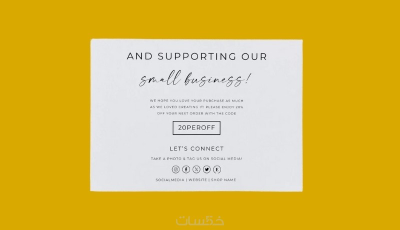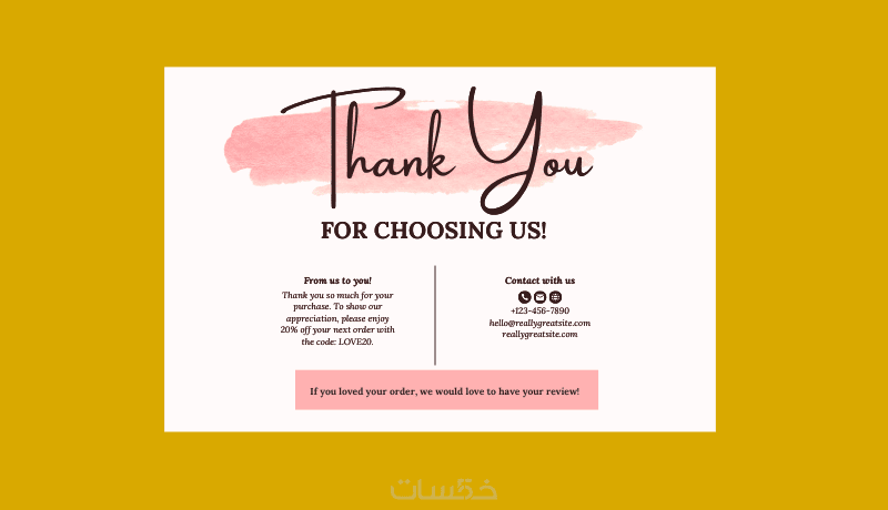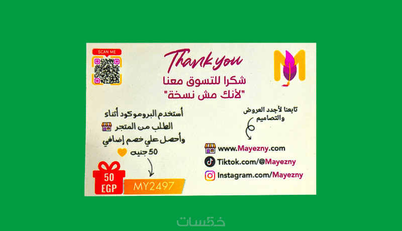 أحرص على أن يعكس التصميم روح نشاطك التجاري، وأن يكون بسيطًا ومعبّرًا ويحمل رسالة شكر إيجابية تساعد في بناء الثقة وتحسين تجربة العميل مع علامتك التجارية.