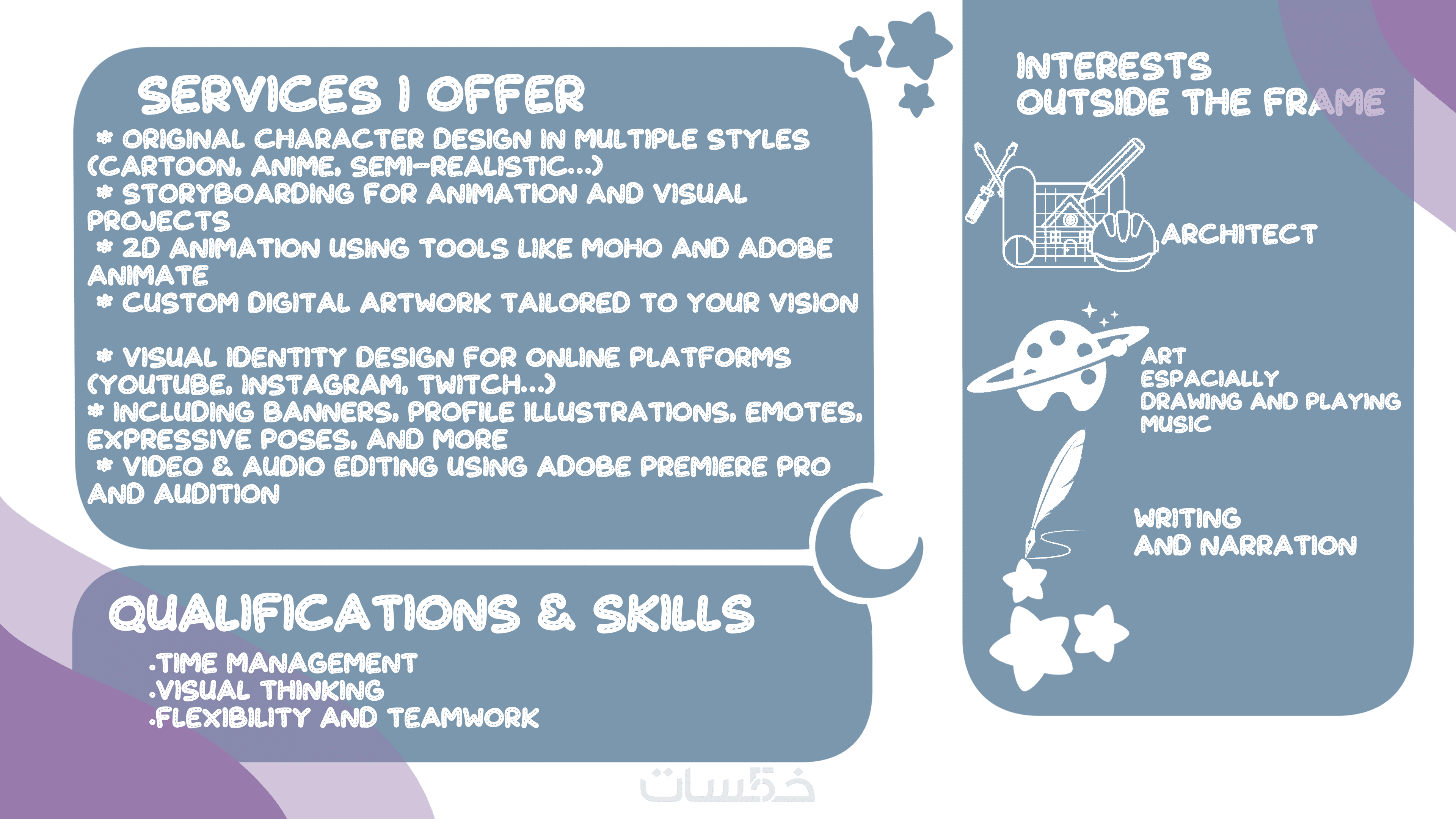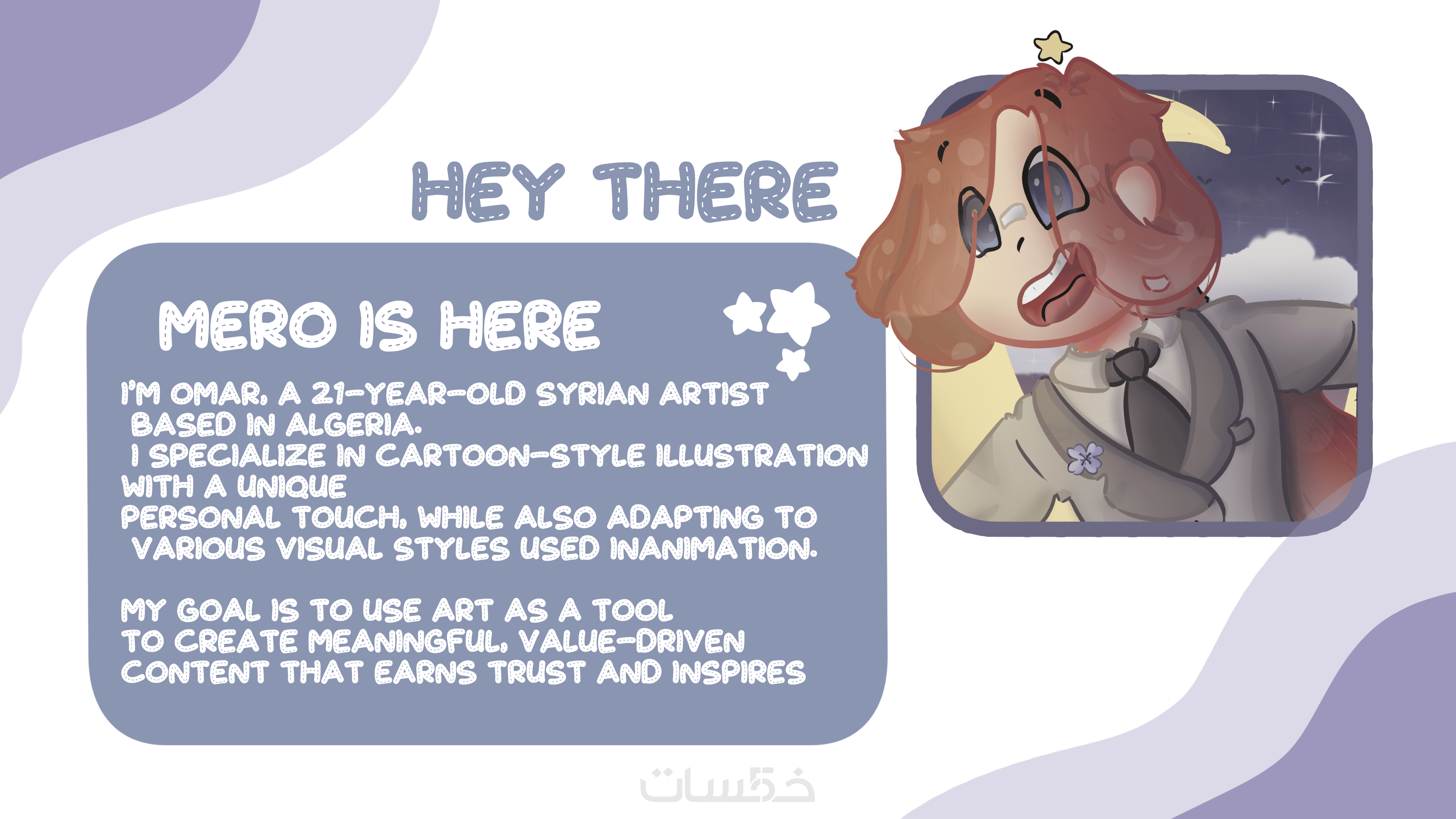 تصميم او اعادة تصميم شخصية بمختلف الاساليب الكرتونية سواء موجهة لرسوم متحركة او قصص او حتى ملحقات وسائل التواصل الاجتماعي والهوية