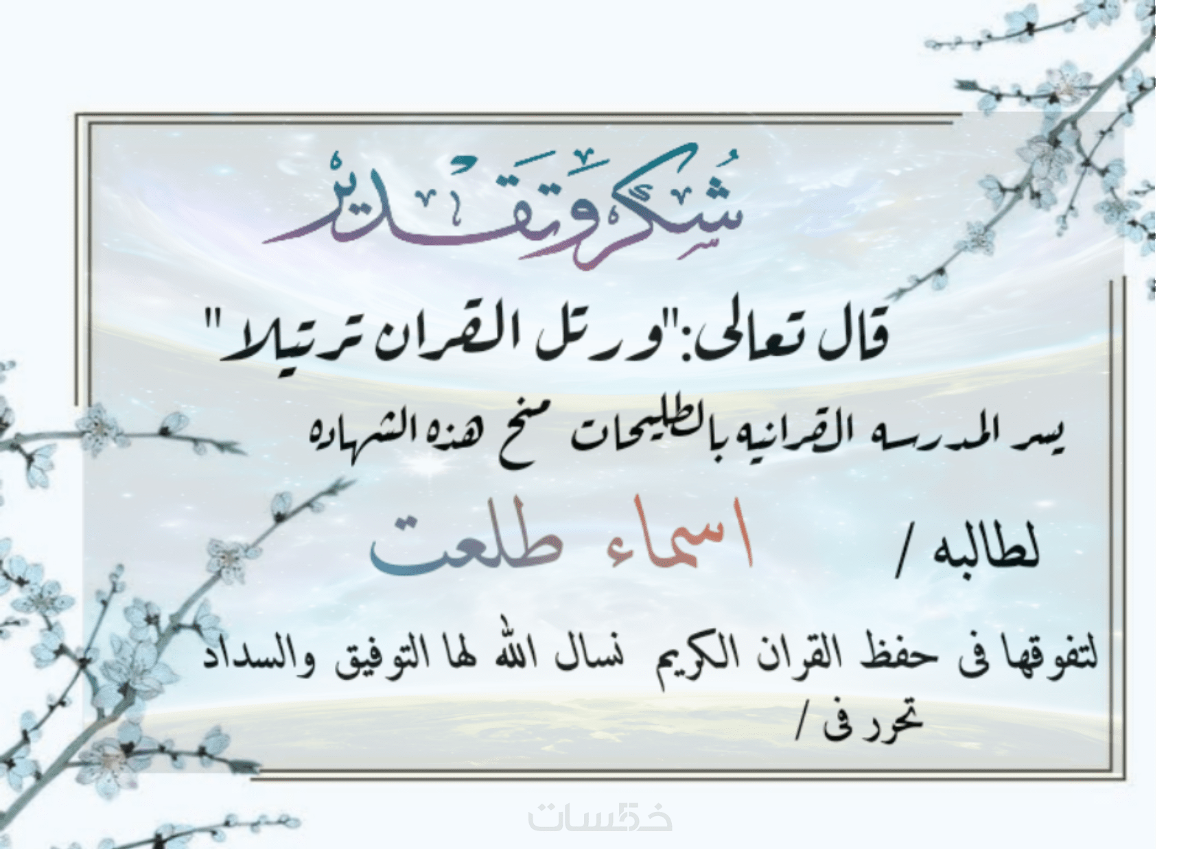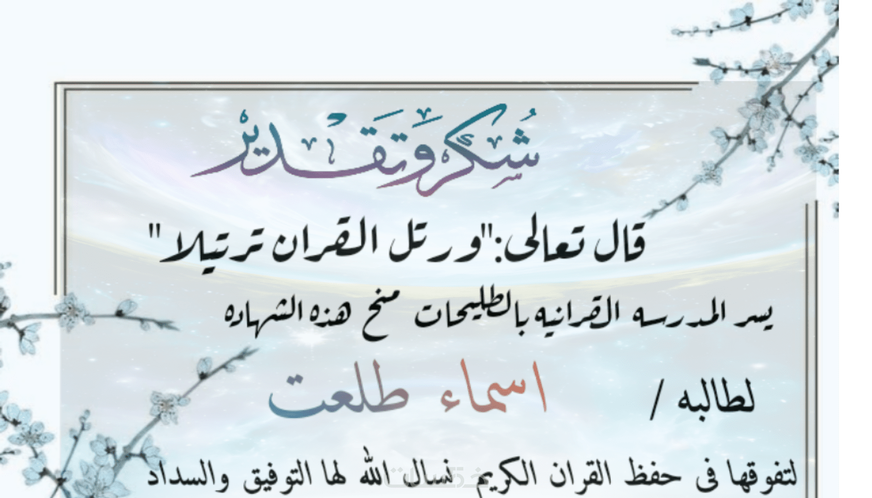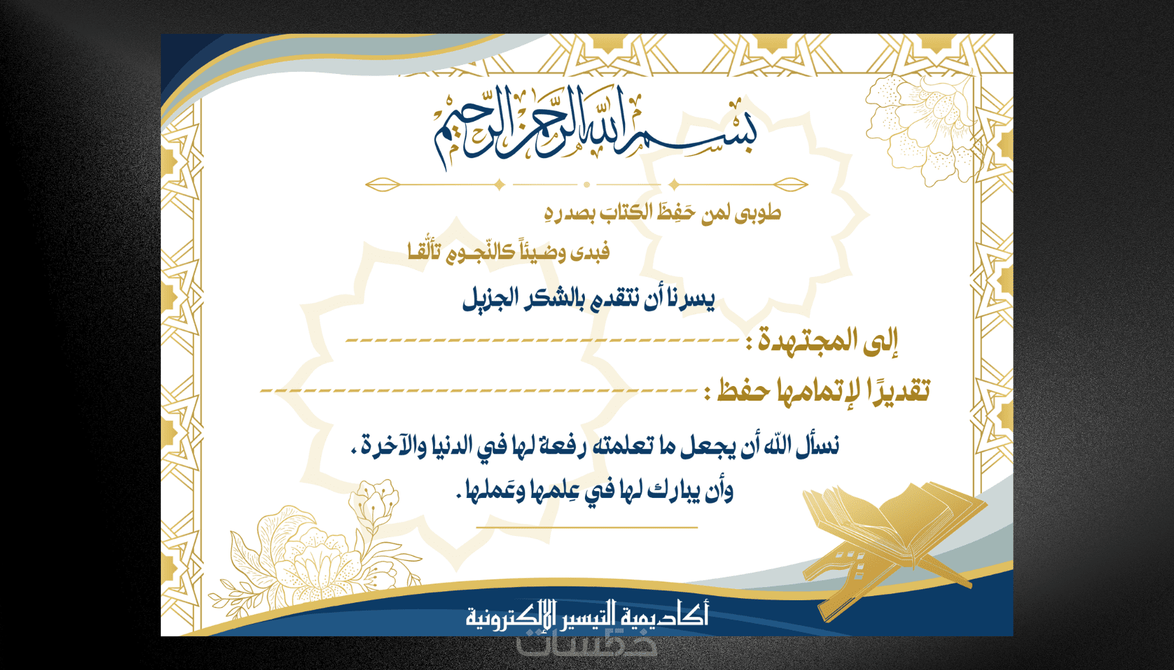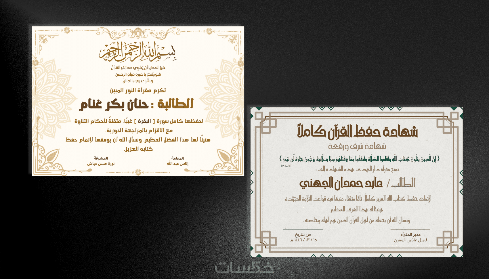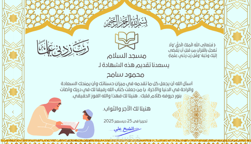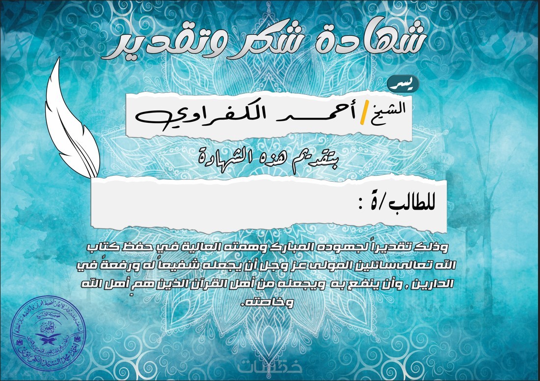تصميم شهادات التقدير لمعلمين ومعلمات القران الكريم لطلابهم