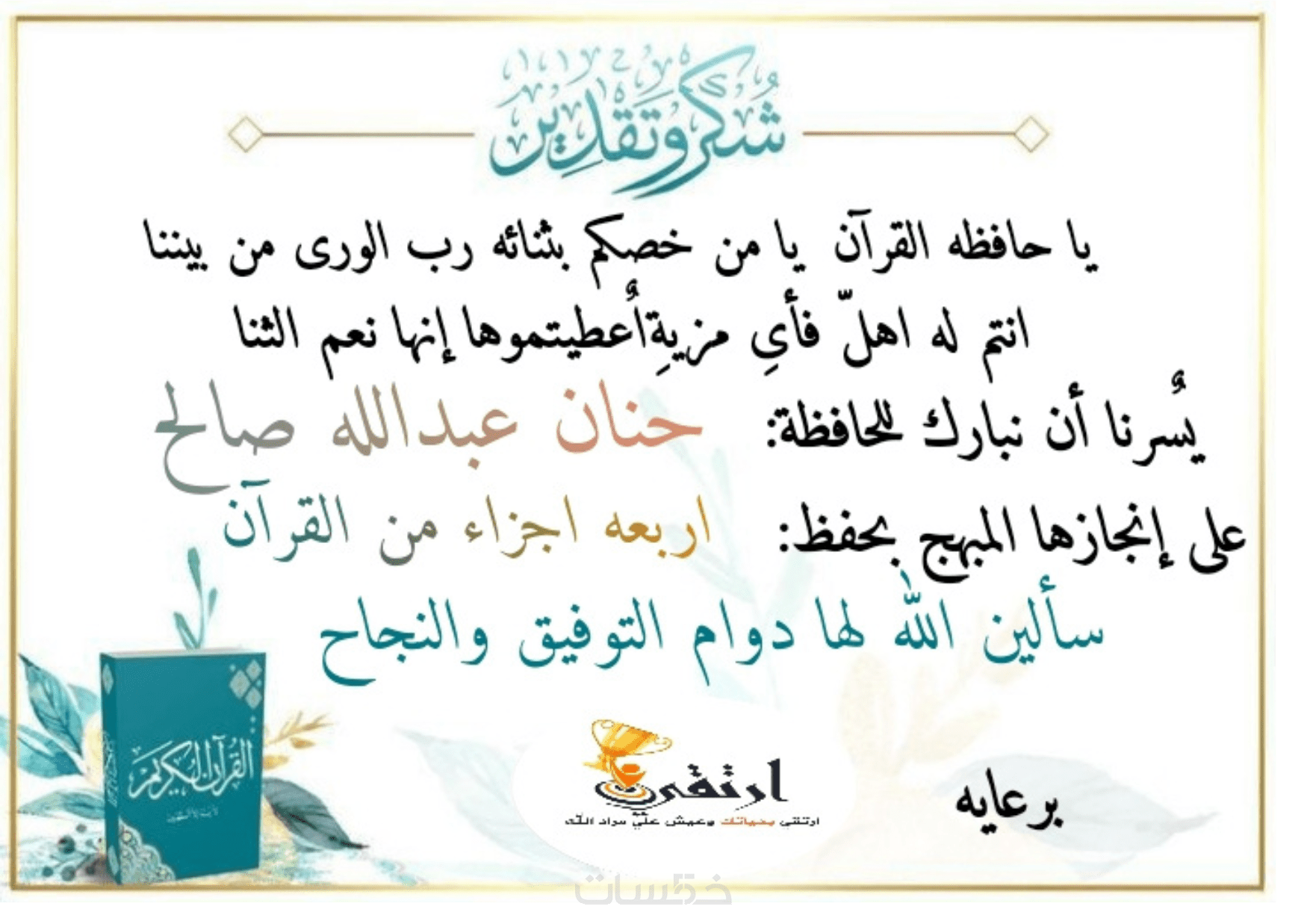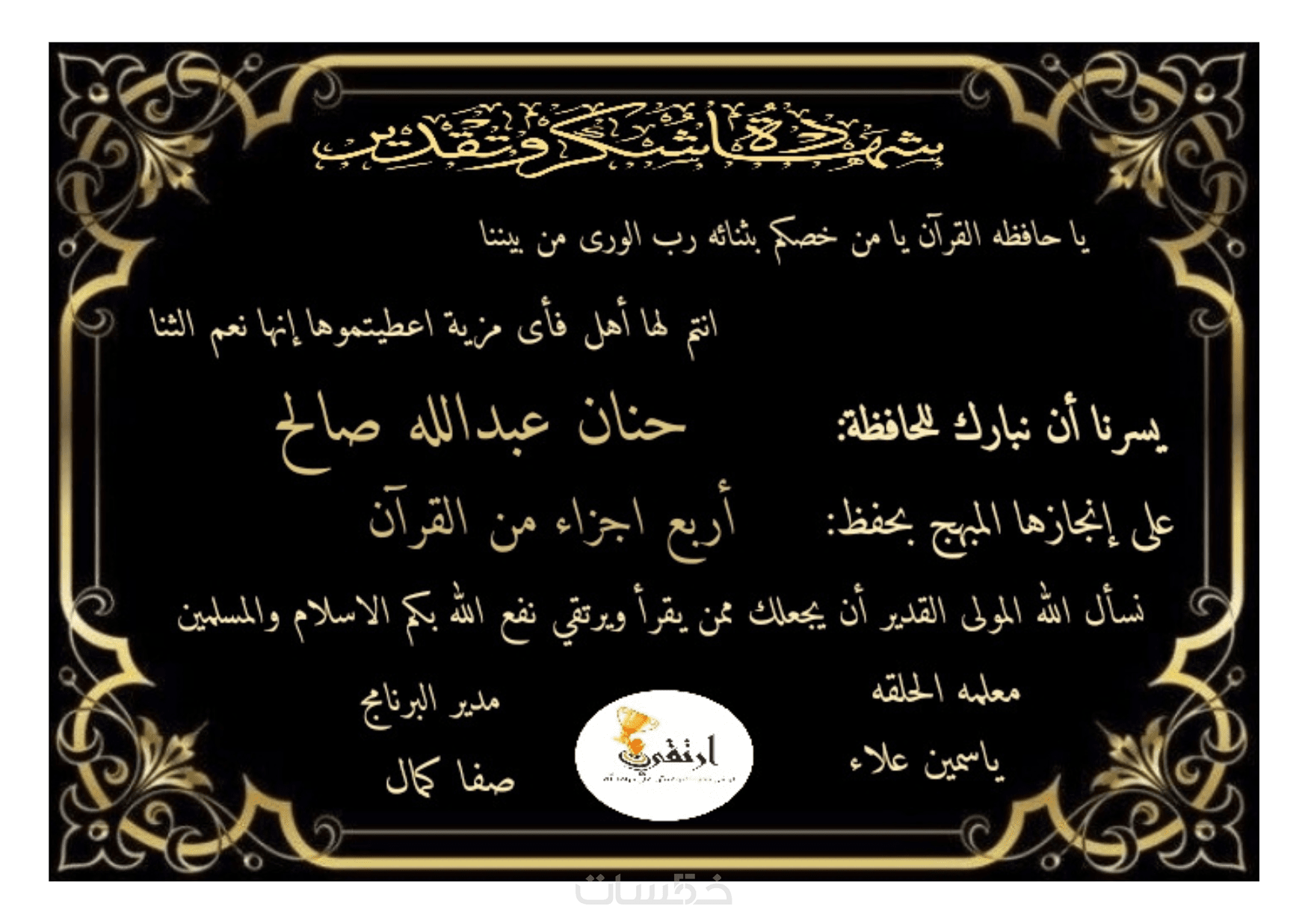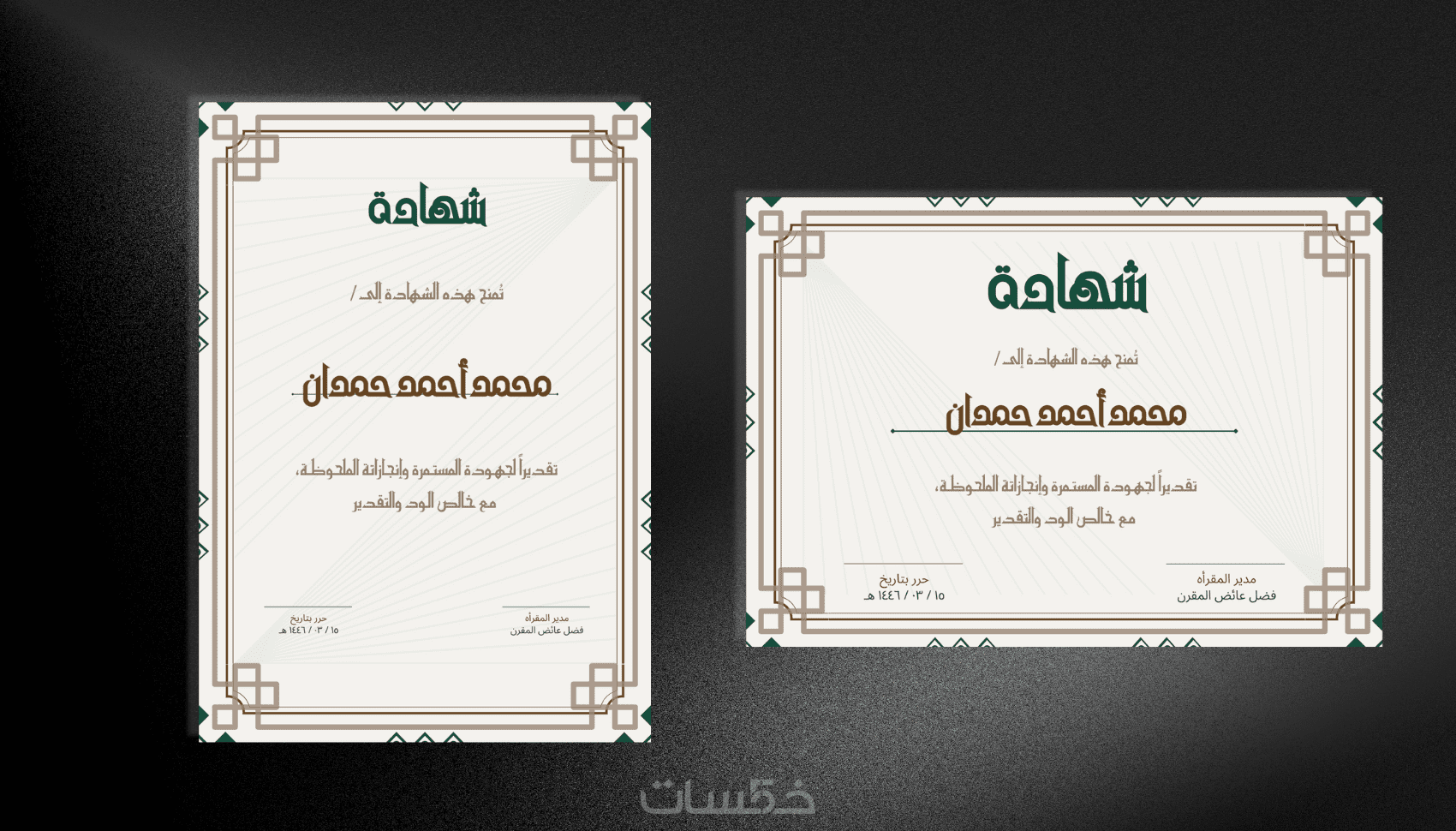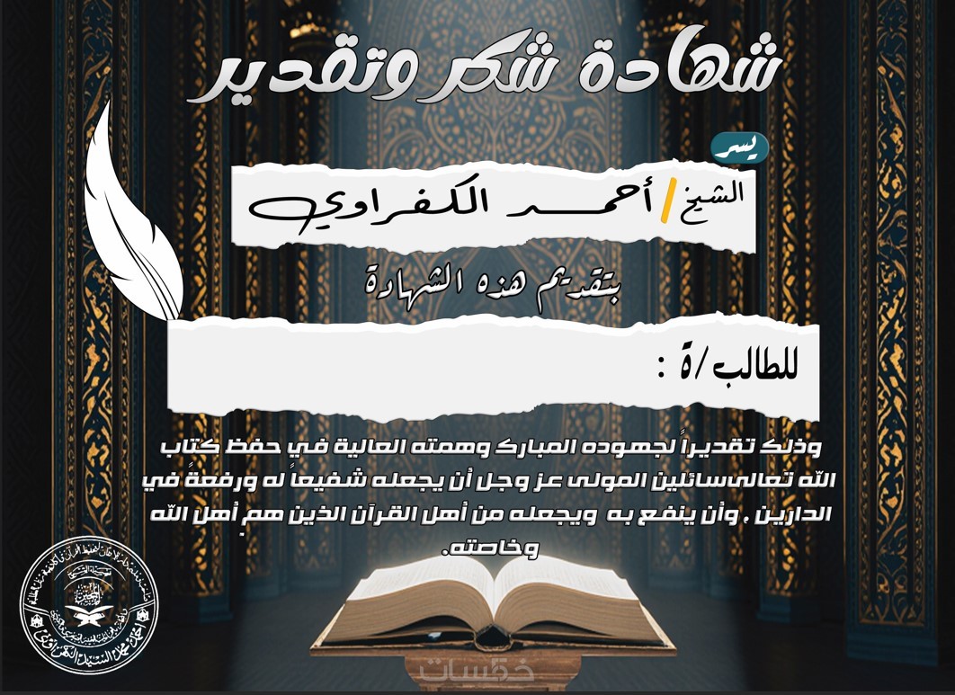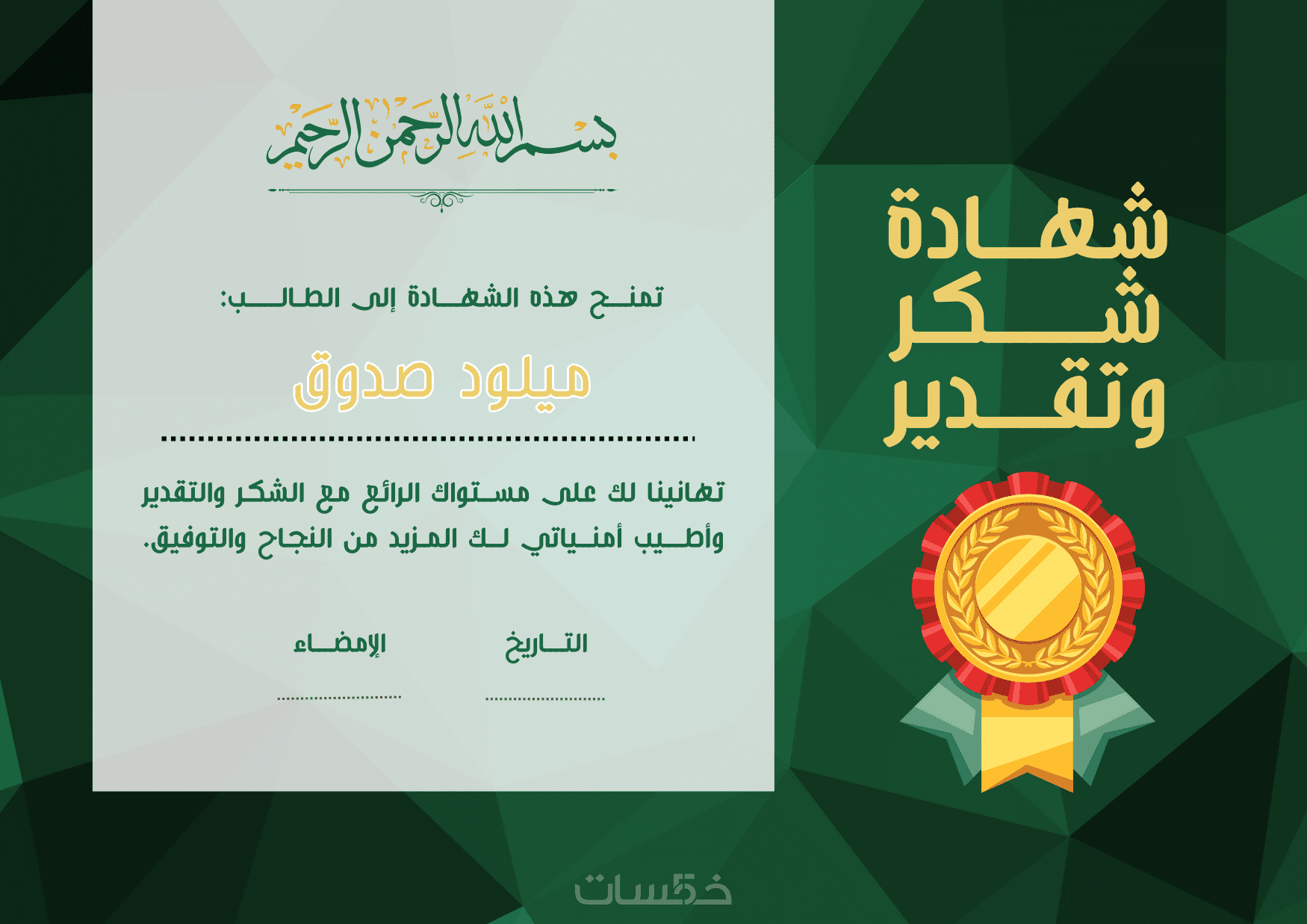تصميم شهادات التقدير لمعلمين ومعلمات القران الكريم لطلابهم