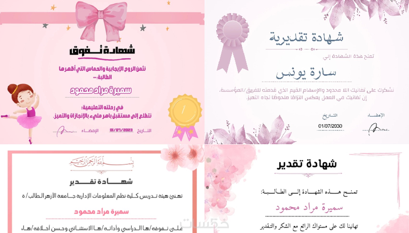 تصميم 50 شهادة باللغة العربية او الانجليزية جميع انواع الشهادات (شهادات شكر وتقدير - شهادات تخرج - شهادات اتمام دورات وكورسات وتدريبات واي نوع من الشهادات)