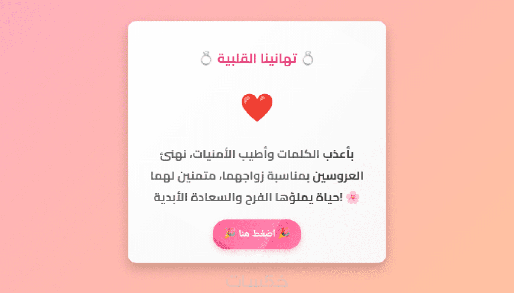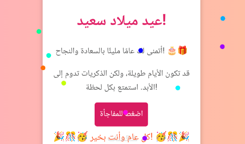 أقوم ببرمجة وتصميم بطاقة تهنئة تفاعلية واحدة مخصصة لمناسبات الزفاف، التخرج، أو التكريم باستخدام HTML وCSS وJavaScript. البطاقة مصممة لتكون متوافقة مع جميع الأجهزة وتعمل بسلاسة على أي متصفح.
