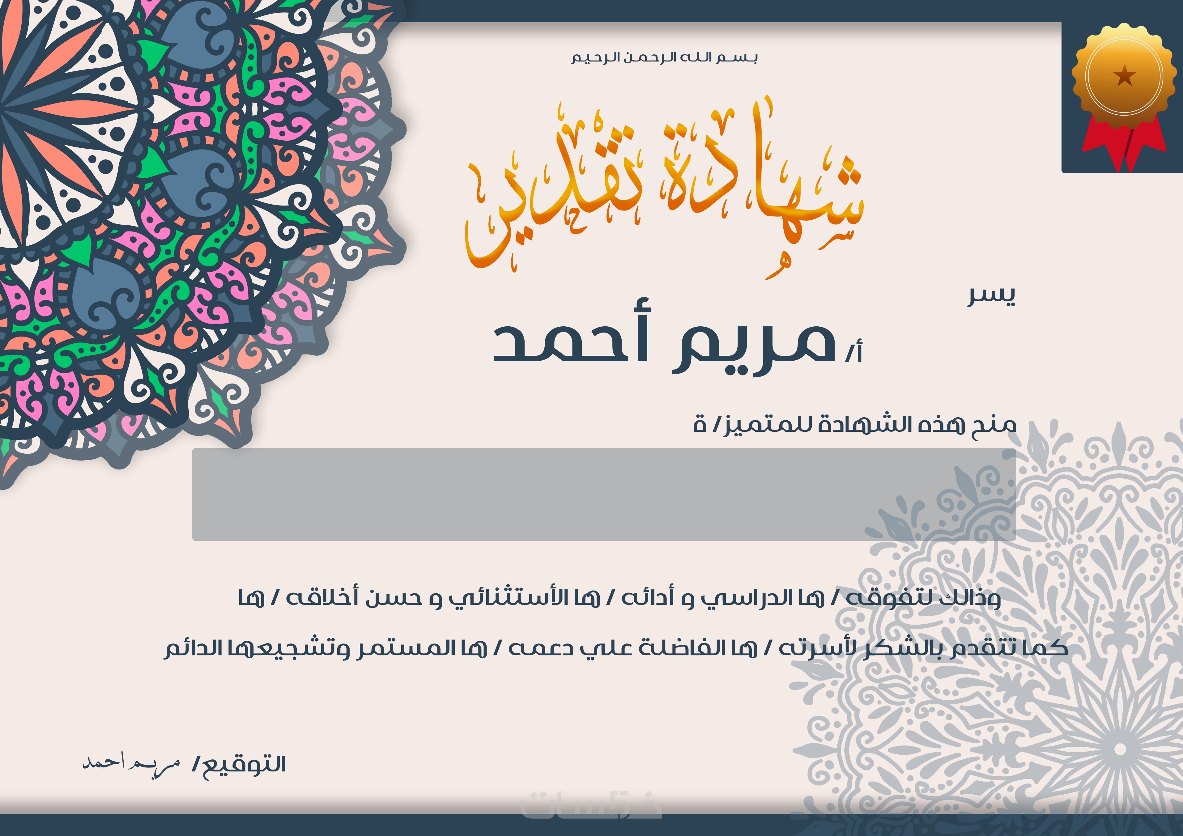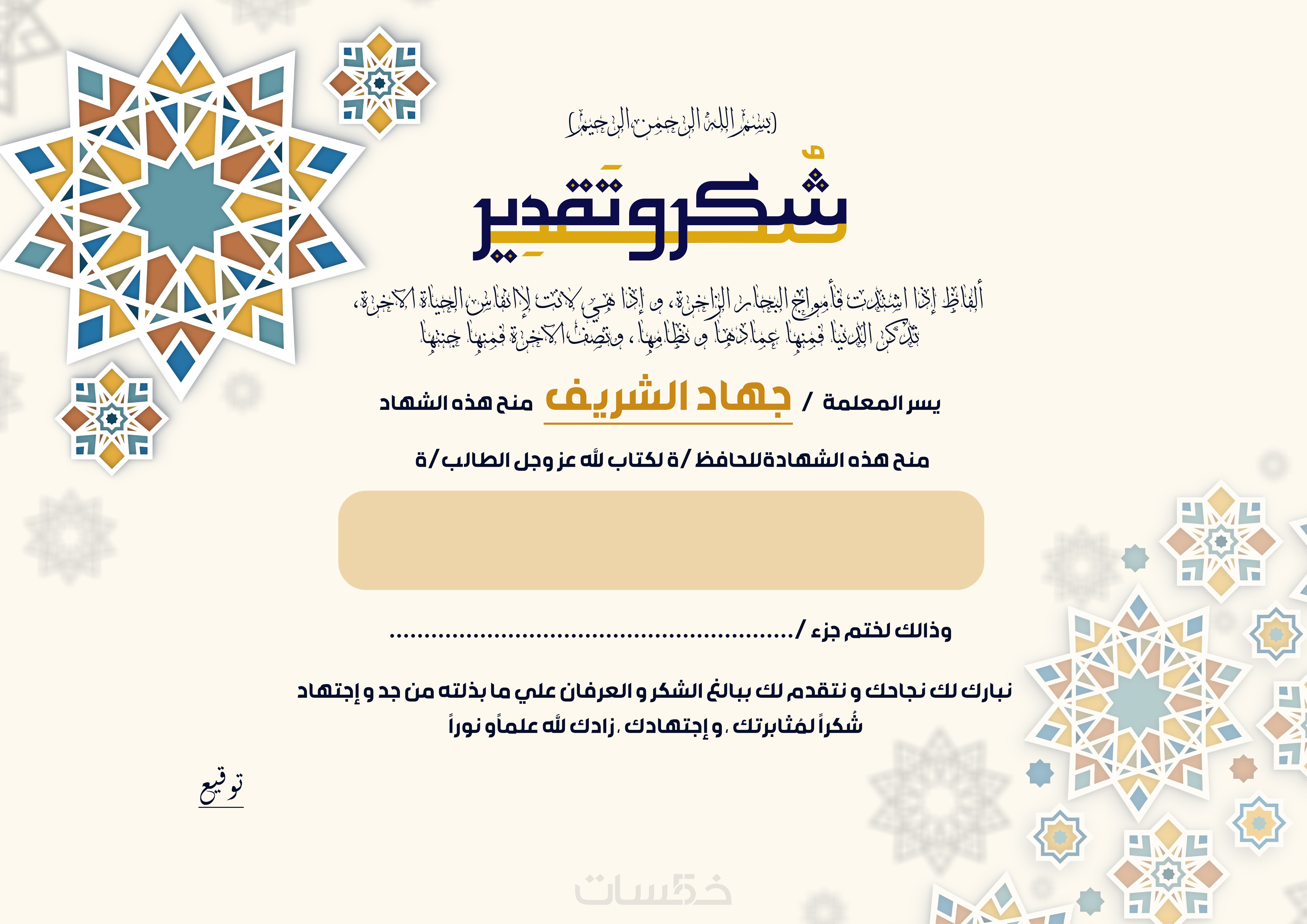 مرحبًا، أنا مصممة جرافيك متخصصة في تصميم المواد الدعائية والتصاميم الرسمية، أقدّم خدمة تصميم شهادات تقدير احترافية تناسب مختلف المناسبات مثل الدورات التدريبية، الفعاليات، المسابقات، والتكريمات الرسمية.