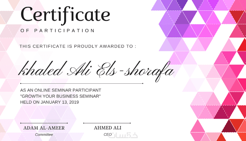 سأصمم لك شهادات احترافية تليق بمناسبتك لأني أعلم جيداً أن الشهادة ليست مجرد ورقة، بل هي تقدير معنوي وثمرة مجهود، لذلك أهتم بكل تفصيلة صغيرة فيها؛ من اختيار الخطوط إلى تنسيق الألوان الفخمة، لتخرج الشهادة بشكل رسمي واحترافي يبهر من يستلمها.