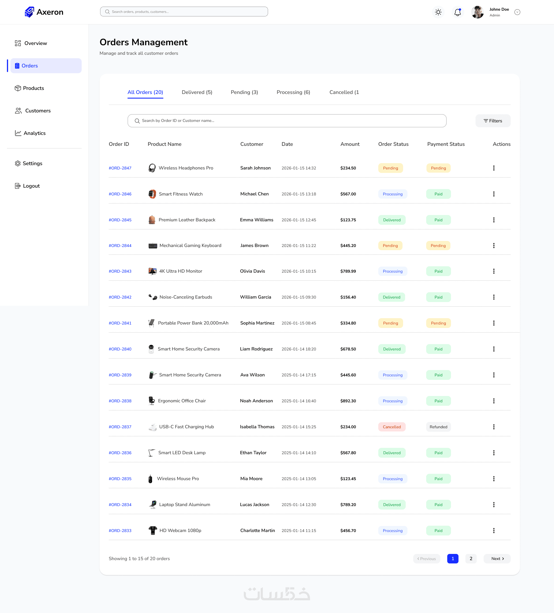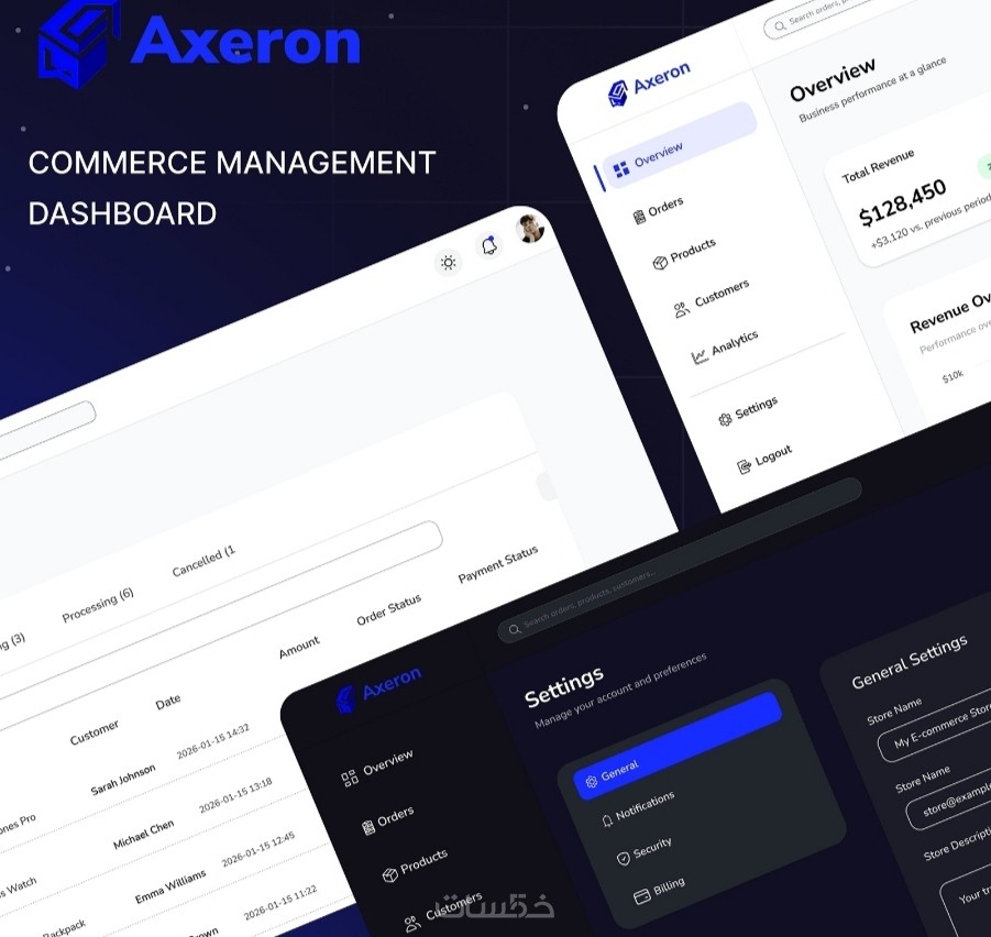 تصميم يشمل عدد 6 صفحات رئيسية لإدارة المتجر الإلكتروني باحترافية، وهي: الصفحة الرئيسية، الطلبات، المنتجات، العملاء، الإعدادات، والتقارير.