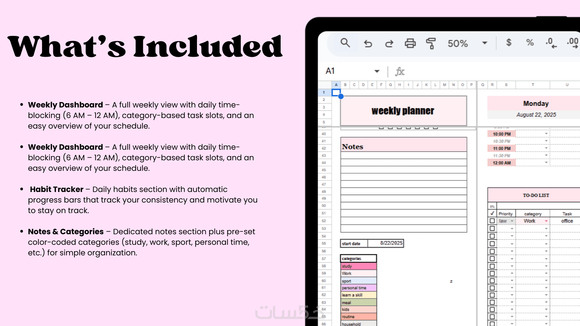 أقدّم لك قالب مخطط أسبوعي رقمي لعام 2025 على Google Sheets، سهل الاستخدام ويعمل على الكمبيوتر والهاتف.