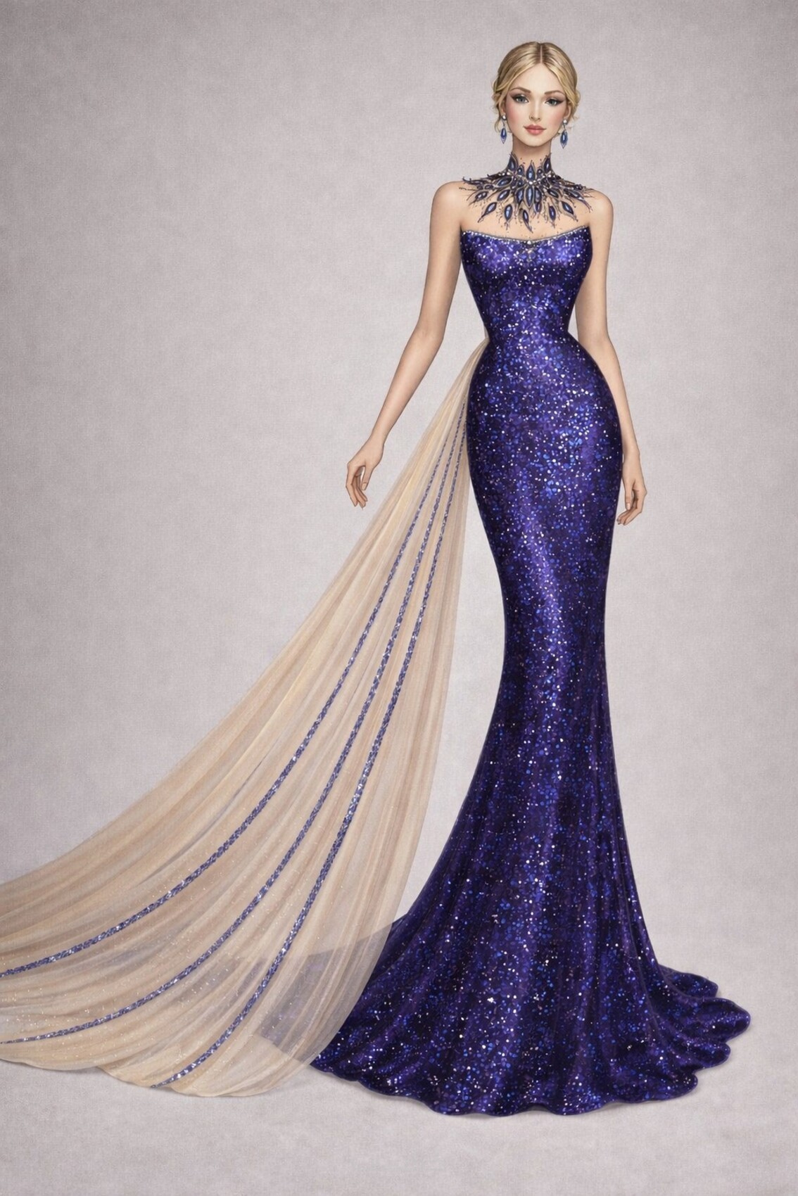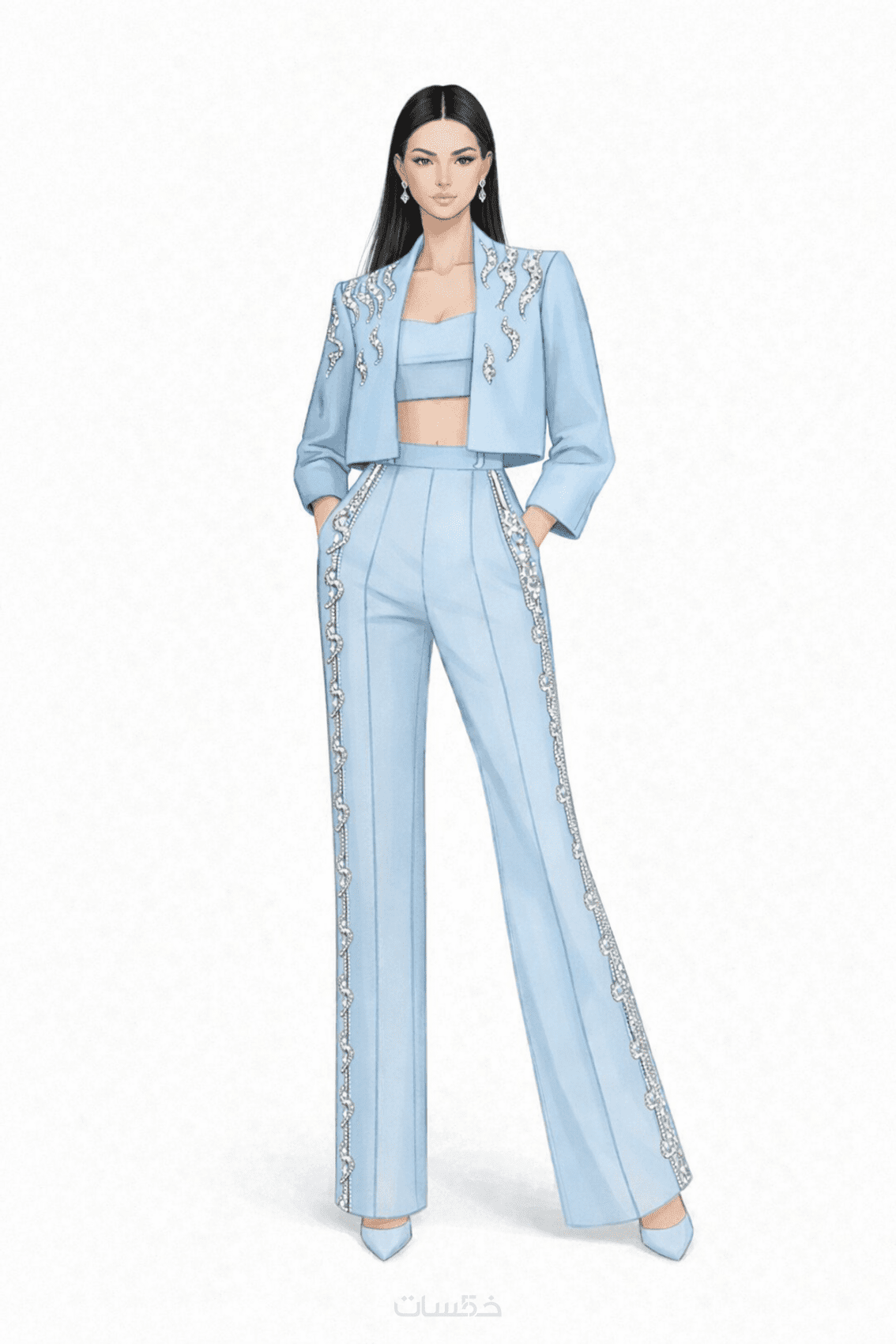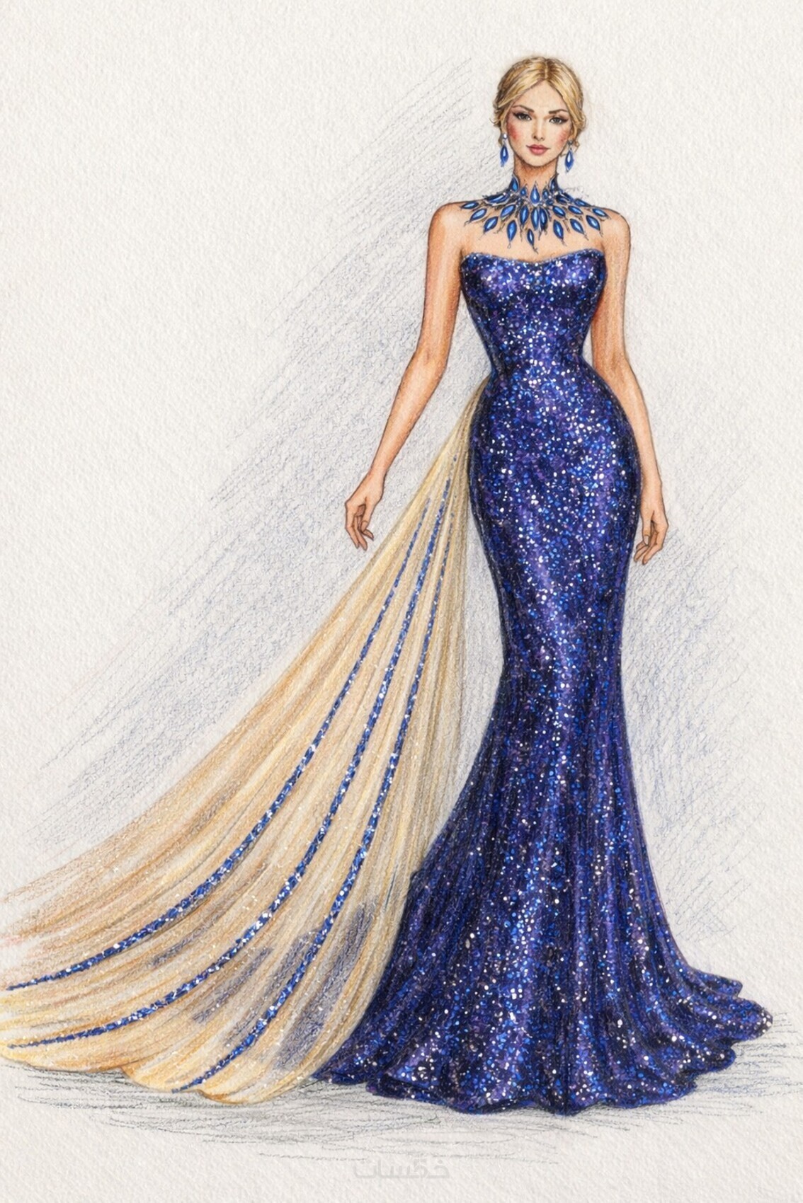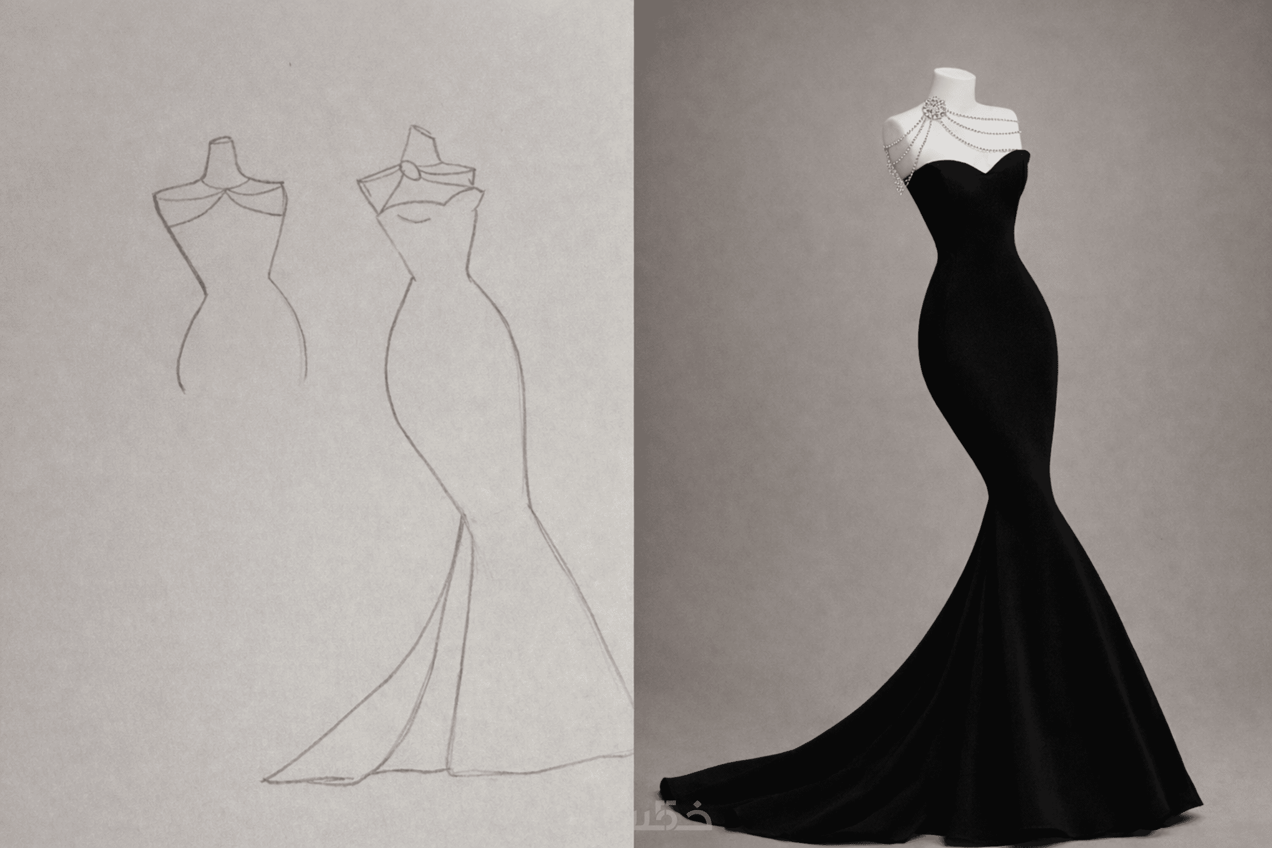 رسم يوضح شكل الفستان، القَصّة، والتفاصيل الأساسية.